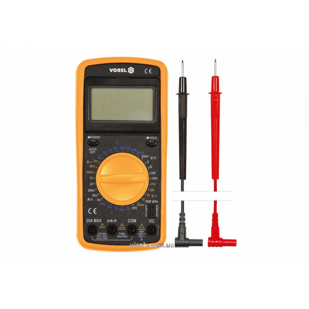 Мультиметр VOREL 81775 - електричний пристрій, який призначений для вимірювання напруги та струму, змінного та постійного. Також дозволяє вимірювати опір, тест провідності та контроль стану індикаторів. Мультиметр має пластиковий корпус, рідкокристалічний дисплей, перемикач діапазона вимірювальних величин. В корпусі встановлені вимірювальні розетки. Мультиметр оснащений вимірювальними проводами.