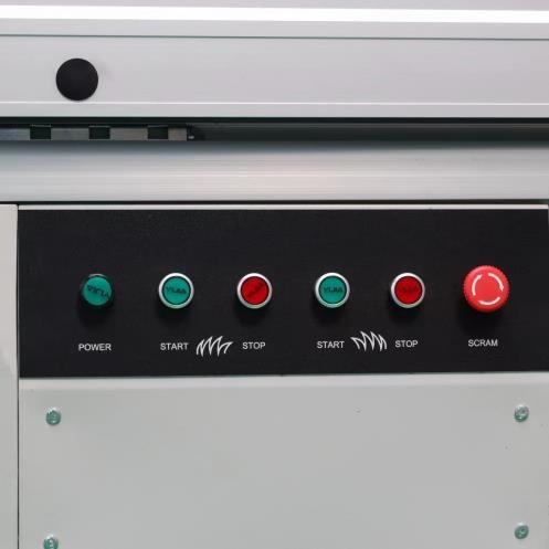 Пульт керування верстата дозволяє оператору швидко включити/вимкнути привід пилок. Кут нахилу зручно регулюється за допомогою маховика на передній панелі верстата.. На панелі встановлено кнопку аварійної зупинки верстата.