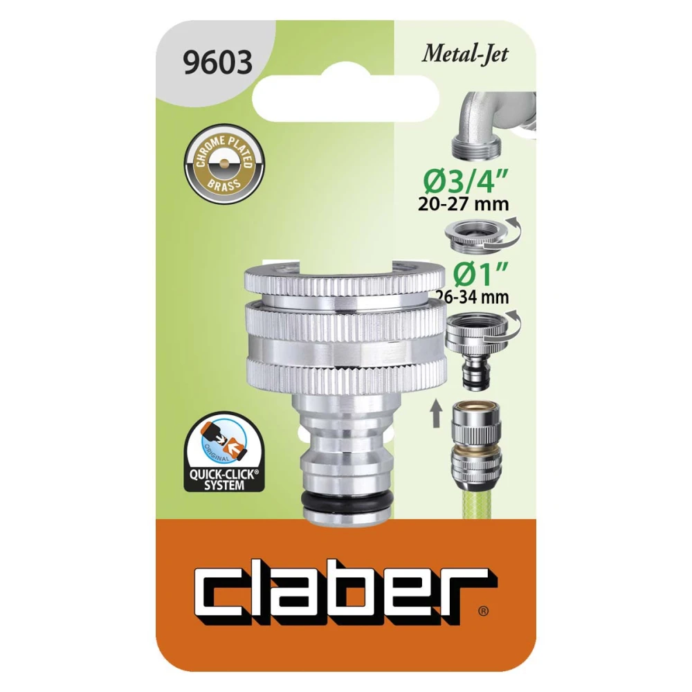 Claber Metal-Jet 9603 - насадка-конектор на садовий кран для підключення будь-яких з'єднань системи Claber Quick-Click типу "мама". Має внутрішнє різьблення 1", але завдяки перехіднику 3/4" його можна встановлювати на менший кран.