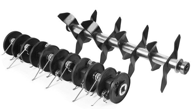 - Вал для скарифікації має ширину 383 мм і оснащений 24 шпицями, які вриваються в землю і виривають з коренів мох і бур'яни.