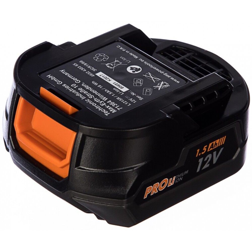 Батарея Li-Ion типа характеризуется слайдерным типом крепления. Ее напряжение равно 12В, а емкость - 1.5 Ач. Не имеет эффекта памяти, что дает возможность заряжать ее в любое удобное время. Корпус АКБ из прочного пластика стойко переносит падения и удары.