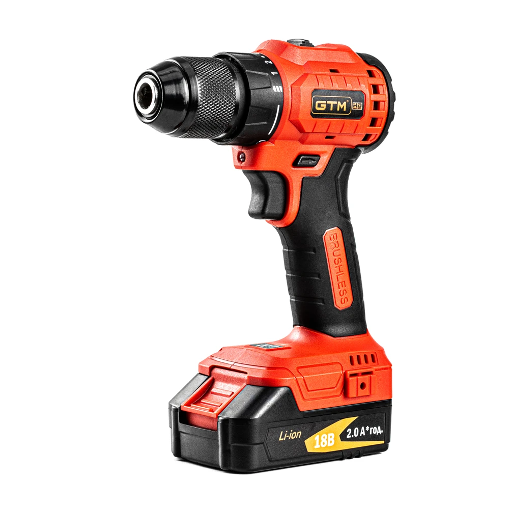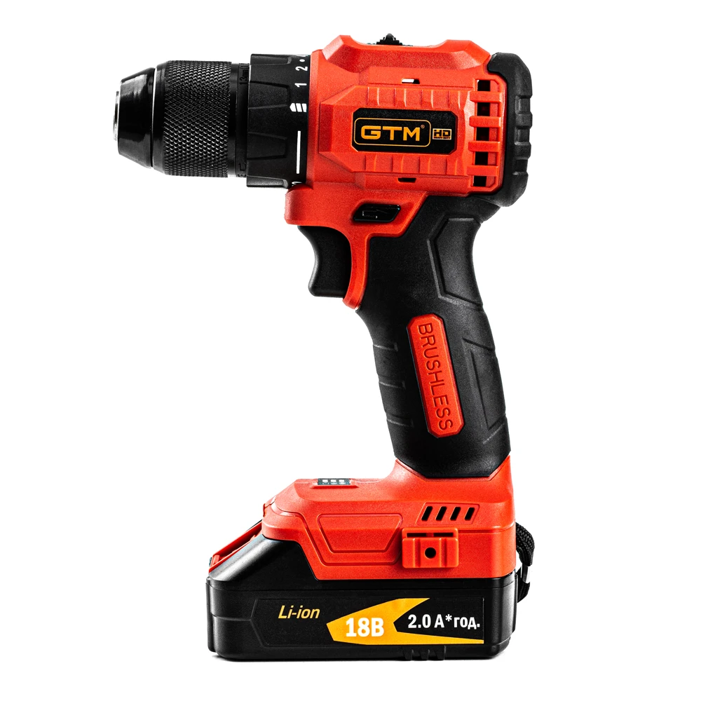 GTM DS18/50BL- дриль-шурупокрутпрофесійного класу з живленням від Li-Ion акумуляторів напругою 18 В. У шурупокруті встановлений суцільнометалевий швидкозатискний 13 мм патрон для роботи з бітами та свердлами. Редуктор у цій моделі двоступінчастий, що дозволяє регулювати максимальну швидкість залежно від завдання. У даній моделі є 18 режимів для закручування кріплень, з максимальним крутним моментом 50 Н*м, а також є режим свердління.