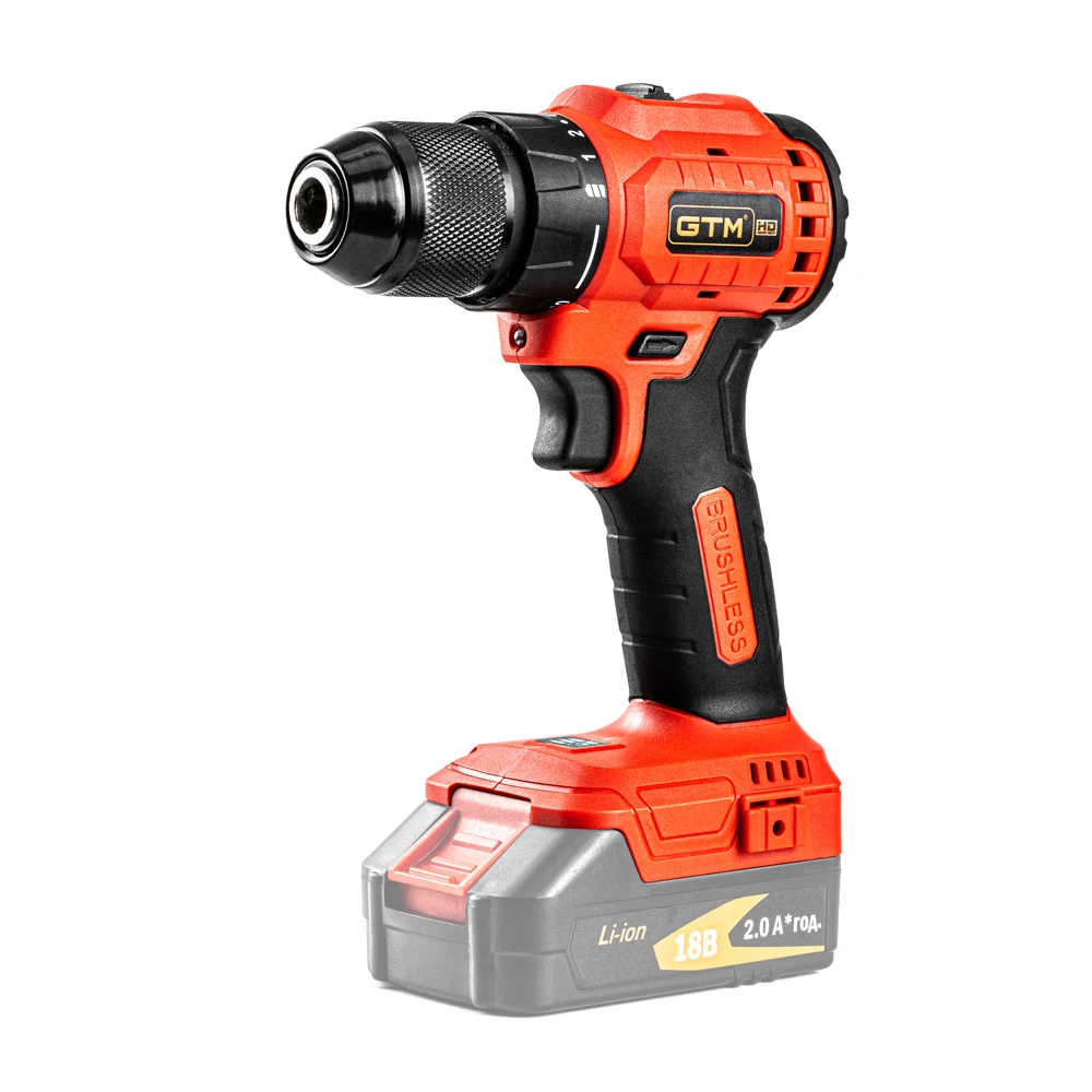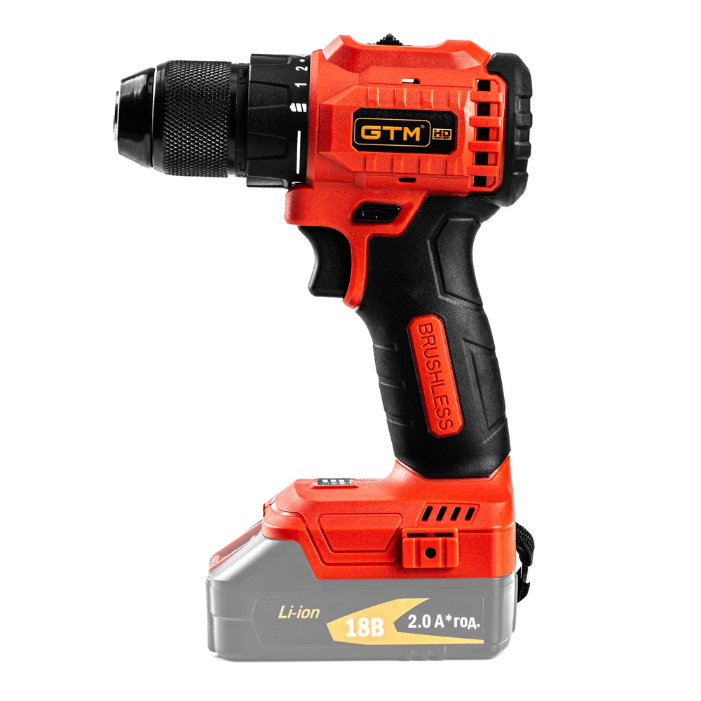 GTM DS18/50BL- дриль-шурупокрутпрофесійного класу з живленням від . У шурупокруті встановлений суцільнометалевий швидкозатискний 13 мм патрон для роботи з бітами та свердлами. Редуктор у цій моделі двоступінчастий, що дозволяє регулювати максимальну швидкість залежно від завдання. У даній моделі є 18 режимів для закручування кріплень, з максимальним крутним моментом 40 Н*м, а також є режим свердління.
