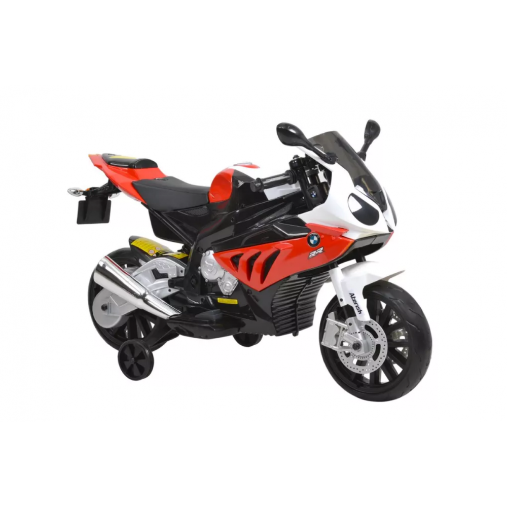 BMW S1000RR RED – дитячий акумуляторний мотоцикл з оригінальним ліцензійним дизайном BMW. Мотоцикл має міцну металеву раму, шини із загартованої гуми, шкіряне сидіння, гумові накладки на кермо. Під тахометром на кермі є місце для 2 батарейок ААА модуля звукових ефектів. З боків спідометра є дві кнопки, ліва запускає гудок, права запускає звук двигуна спортивного мотоцикла. Коробка запалювання зі справжнім ключем служить головним вимикачем, вона знаходиться в кришці під правим кермом. Під лівим кермом– перемикач швидкості. Максимальна швидкість від 3 до 6 км/год. Мотоцикл працює від пари електродвигунів потужністю 2 х 35 Вт, які живляться від акумулятора 12 В/7 Ач. З зарядним пристроєм, що входить в комплект, акумулятор повністю заряджається приблизно за 8-12 годин, час роботи приблизно 1-2 години в залежності від ваги дитини та місцевості. Призначений для дітей від 3 до 8 років, його вантажопідйомність 30 кг.