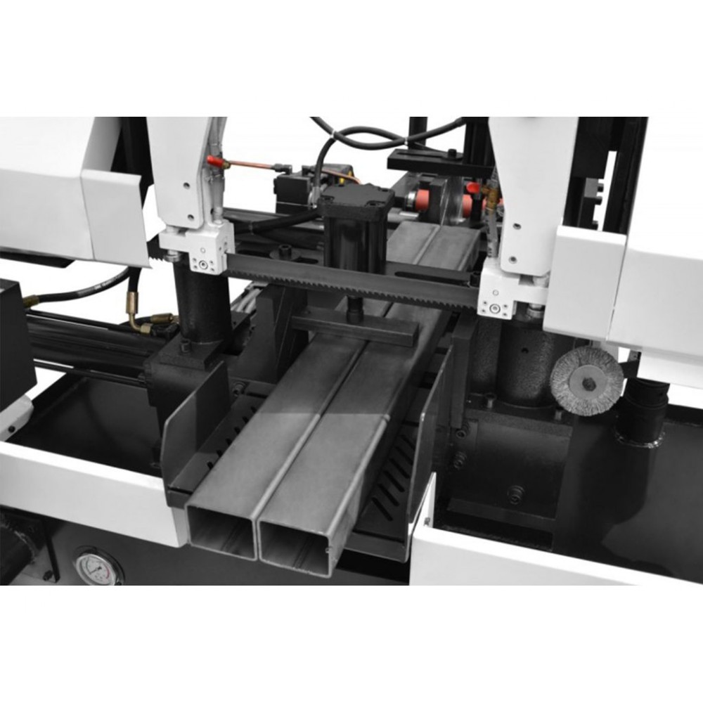 На стрічково-пильному верстаті встановлені подвійні лещата, одні використовуються для затискання при розпилюванні, другі для подачі заготовки на заданий розмір. Довжина подачі контролюється ультрафіолетовим датчиком руху, який контролює нульову точку та величину переміщення заготовки.