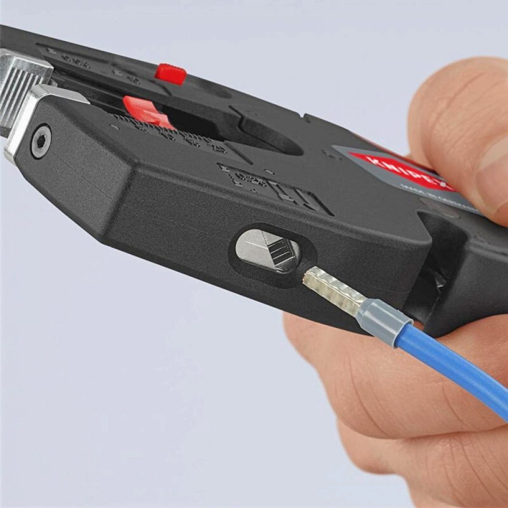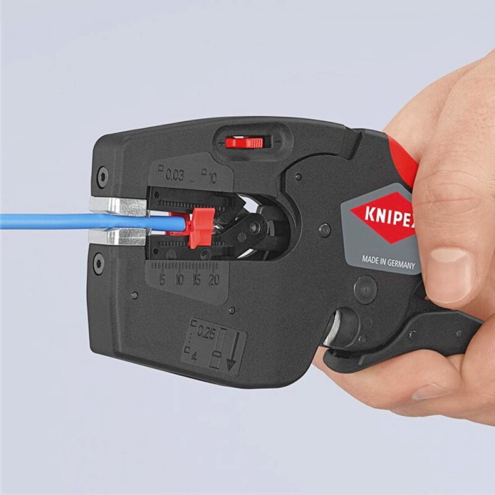 Автоматичний стрипер Knipex 12 72 190 з трьома функціями: Зачищення дроту до 10 мм² Обтискання 4 мм² або 2x2,5 мм² Сила розрізу 10 мм ² Точне очищення: автоматично адаптується до відповідного діаметру кабелю та забезпечує ту ж довжину зміцнення, регулюючи довжину Ідеальний обтиск: швидке і точне поколювання наконечника забезпечується автоматичним регулюванням. Багатокомпонентні ручки надають у ваших руках зручний інструмент для утримання Швидкий, точний квадратний наконечник відповідно до DIN 46228. Регулювання точності - для оптимального регулювання спеціальних матеріалів або умов температури для гнучких і твердих кабелів в діапазоні від 0,03 до 10 мм² (AWG 32 - 8) Чисто відрізання кабелі до 10 мм² (AWG 8) Високоякісний корпус із посиленого скловолокном пластику Ідеальний обтиск: швидкий та рівномірний обтиск під прямим кутом для окремих кабельних наконечників, обтискний механізм з храповим механізмом гарантує необхідне зусилля обтиску Точне зачищення: автоматично адаптується до відповідного діаметру кабелю і забезпечує постійну довжину зачистки завдяки регульованому обмежувачу довжини, особливо при роботах, що повторюються. Багатокомпонентні рукоятки забезпечують нековзну та зручну роботу Швидкий і точний квадратний обжим одинарних кабельних наконечників відповідно до DIN 46228 частини 1+4, що саморегулюється для розмірів 0,25 – 4 мм² / 2 x 2,5 мм² – дозволяє швидко обтискати різні розміри Висока якість опресування, що повторюється завдяки храповому механізму з повним циклом опресування Зачищення з точним регулюванням – для оптимальної адаптації до особливих матеріалів або температурних умов для гнучких та одножильних провідників перерізом від 0,03 до 10 мм² (AWG 32-8) Чисто ріже провідники перетином до 10 мм² (AWG 8) Якісний корпус із армованого скловолокном пластику Для торгівлі електротехнікою: для побутових установок та електропроводки електронних пристроїв, таких як ПЛК (програмований логічний контролер) Інструмент для зачищення проводів з трьома функціями: зачищення проводів перетином до 10 мм², можливість обтискання 4 мм² або 2 x 2,5 мм² та можливість різання 10 мм²