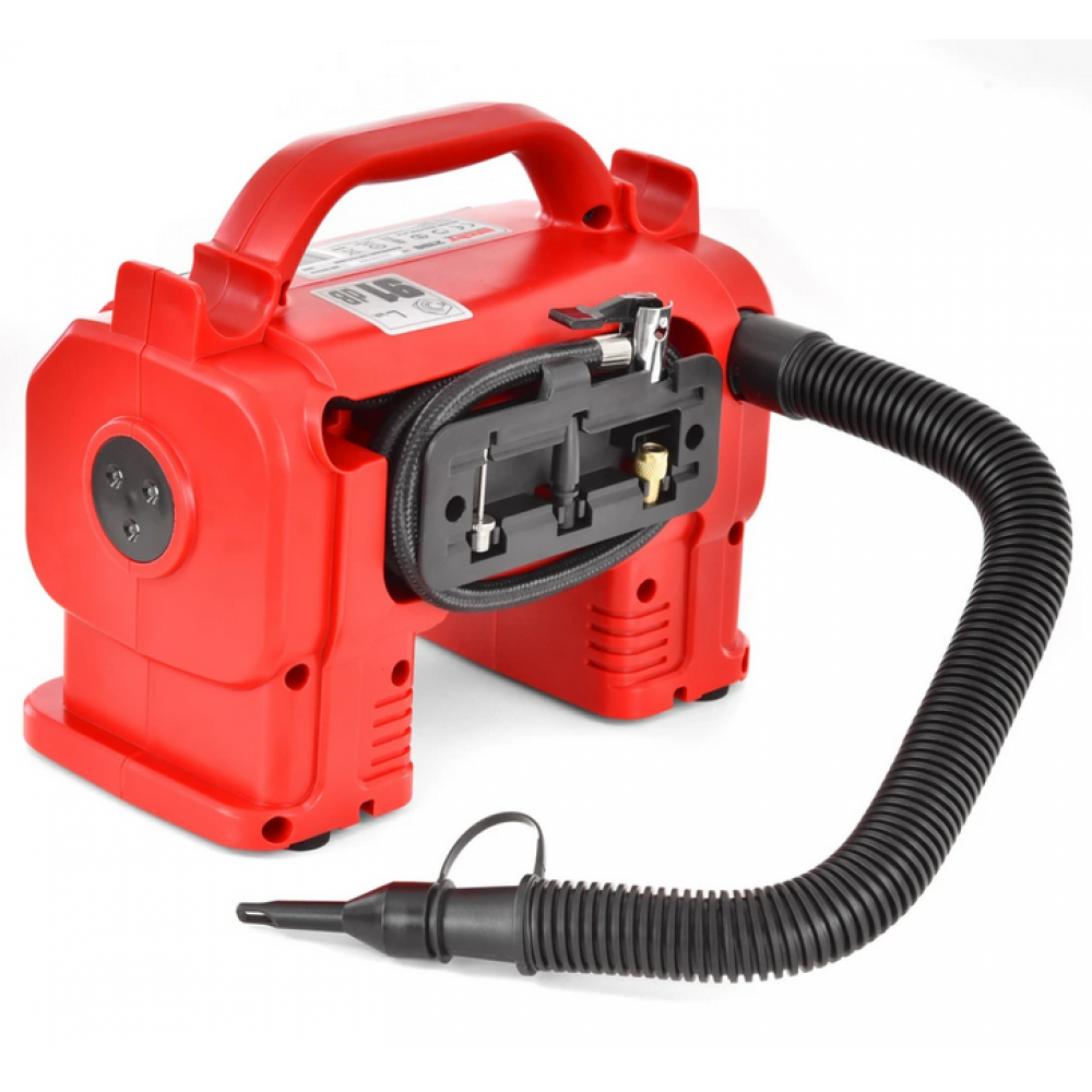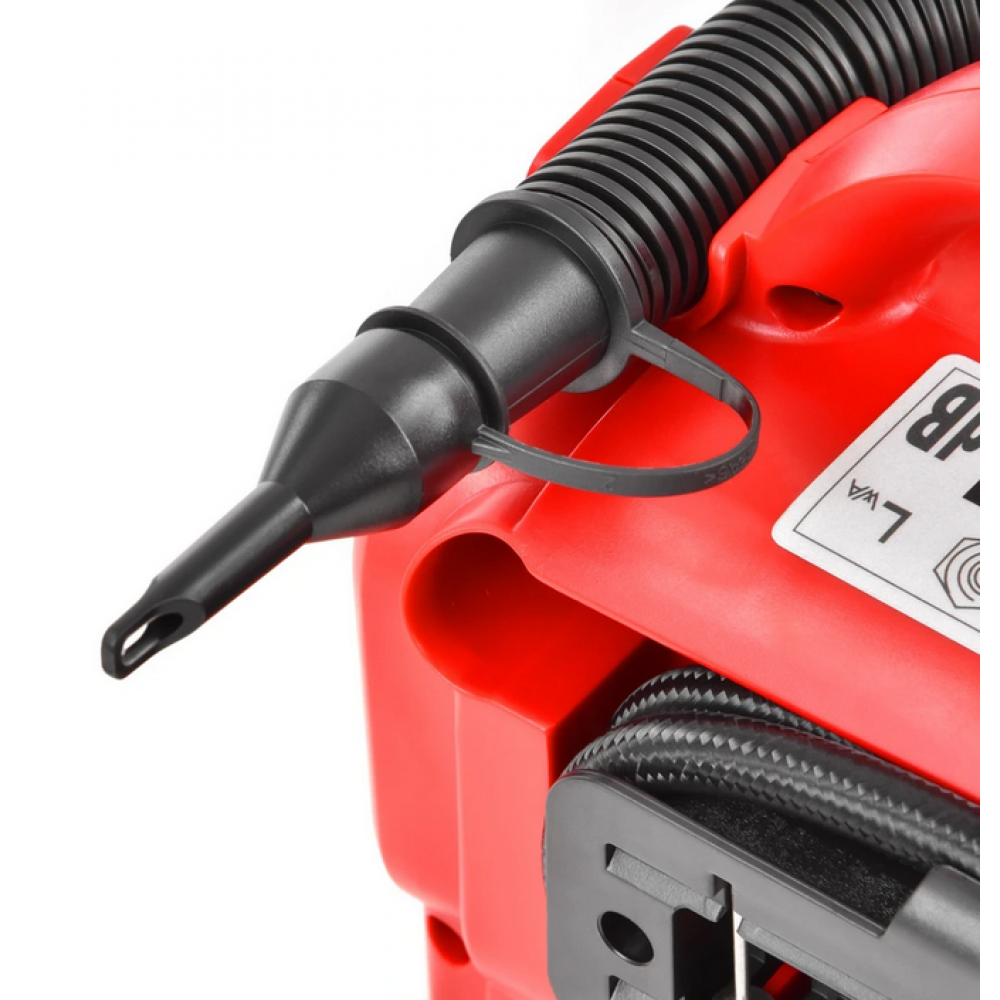 - Друга функція – режим обдування для надування іграшок, матраців, басейнів, надувних човнів тощо. Для цього не потрібно такого тиску, як для шин, особливо оцініть високий потік повітря, щоб човен, матрац, басейн або іграшки накачуються якнайшвидше. Тому для продування використовується не класичний поршневий компресор, а турбіна, аналогічна, наприклад, тій, що стоїть у звичайному пилососі.