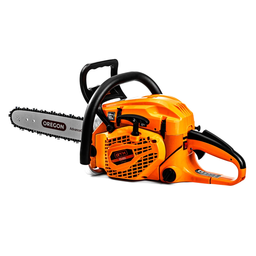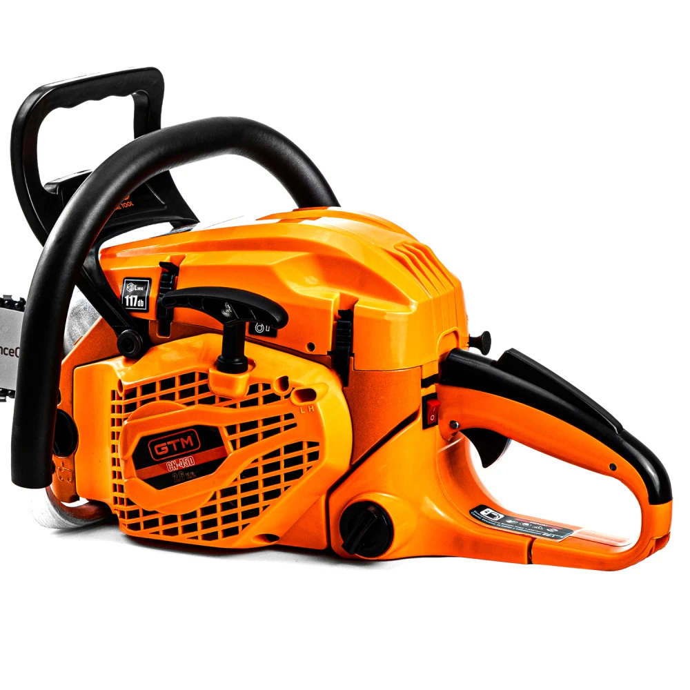 GTM CN45D - високопродуктивна бензопила напівпрофесійного класу, призначена для середніх навантажень під час обрізання саду, заготівлі дров, столярних і теслярських роботах в будинку. Інструмент обладнаний 2-тактним бензиновим двигуном з потужністю 1,9 кВт (2,6 к.с.) з підвищеним крутним моментом і збільшеним ресурсом роботи. Як паливо використовується суміш бензину з моторним мастилом у пропорції 40:1 (на 1 л бензину 25 мл мастила).