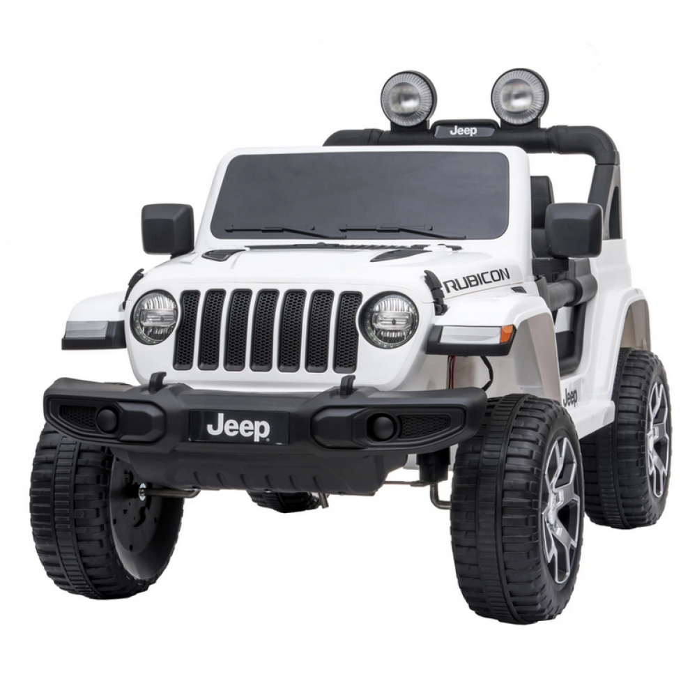 Білий Jeep Wrangler Rubicon на акумуляторі. Підходить для дітей віком 3-8 років. Максимальне навантаження 35 кг. Акумулятор 12 В, 10 Ач / 12 В, двигуни 2 х 35 Вт, звукові та світлові ефекти, MP3, USB, SD. Оригінальна ліцензія Jeep Wrangler Rubicon. Розміри: 126 х 70 х 80 см.