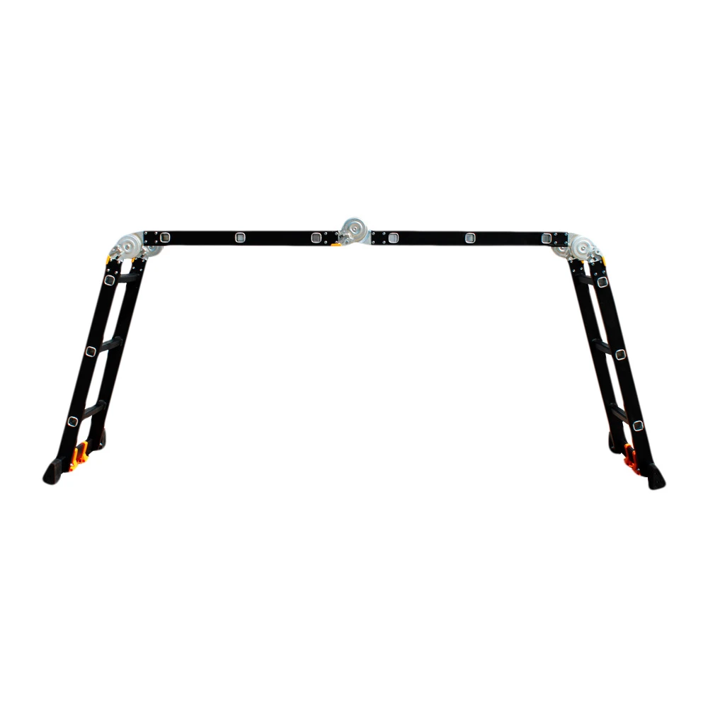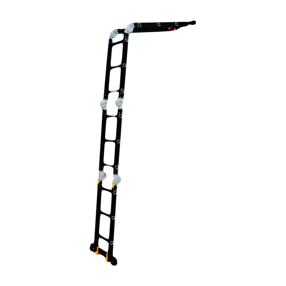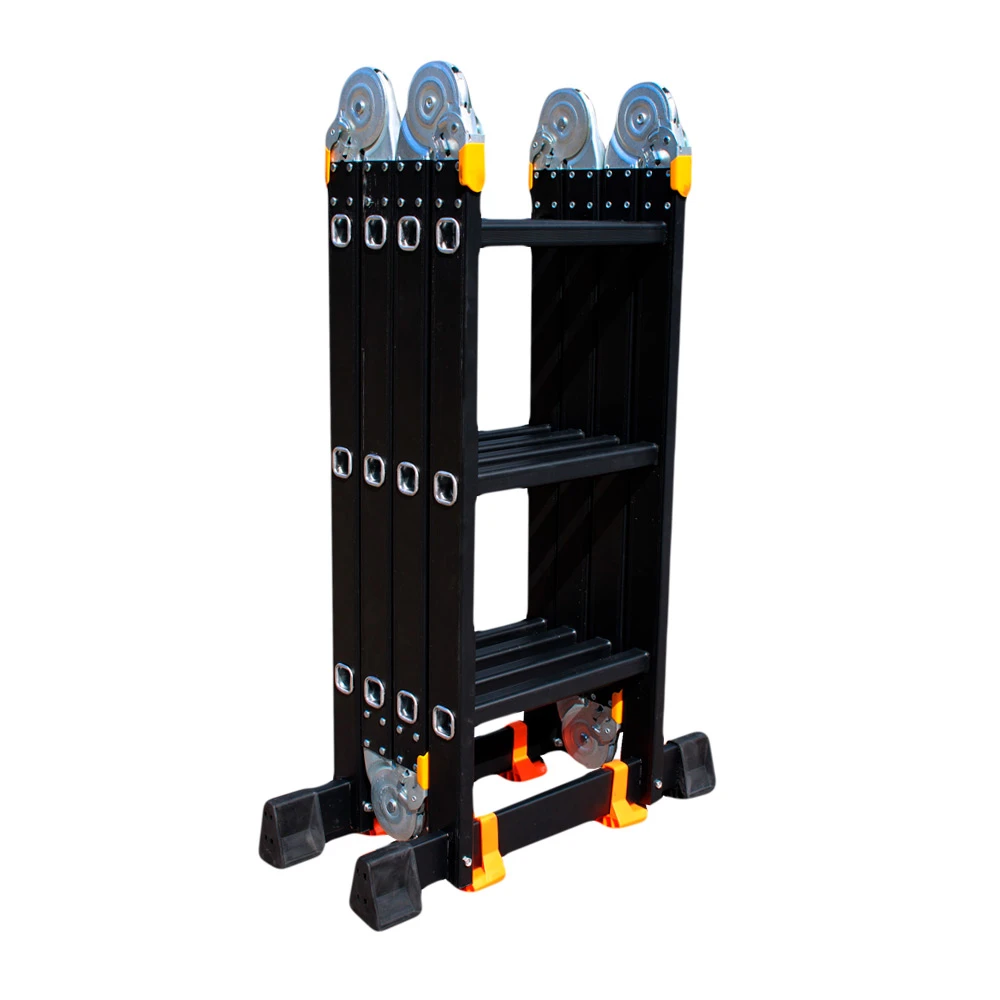 GTM KMP403A - легка драбина-трансформер підвищеної міцності, яка призначається для постійного промислового і побутового використання. Профіль виготовлений з авіаційного алюмінію, має змінну товщину стінки і додатково посилений ребрами жорсткості. Для додаткової стійкості до пошкоджень корпус пофарбований в чорний колір методом електрофорезу. Міцні шарніри і замки надійно фіксують сходи в будь-який з обраних форм. Завдяки такій конструкції трансформер GTM KMP403A здатний витримати без деформації навантаження в 150 кг.