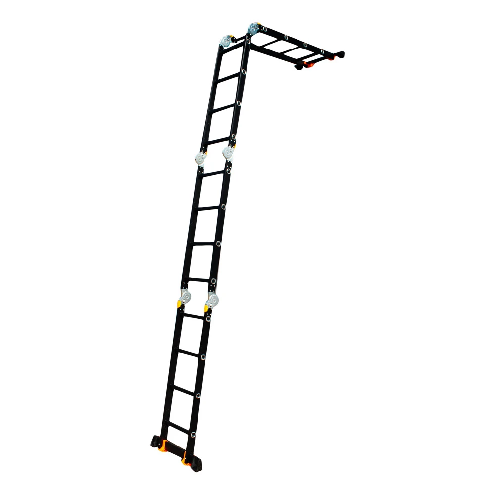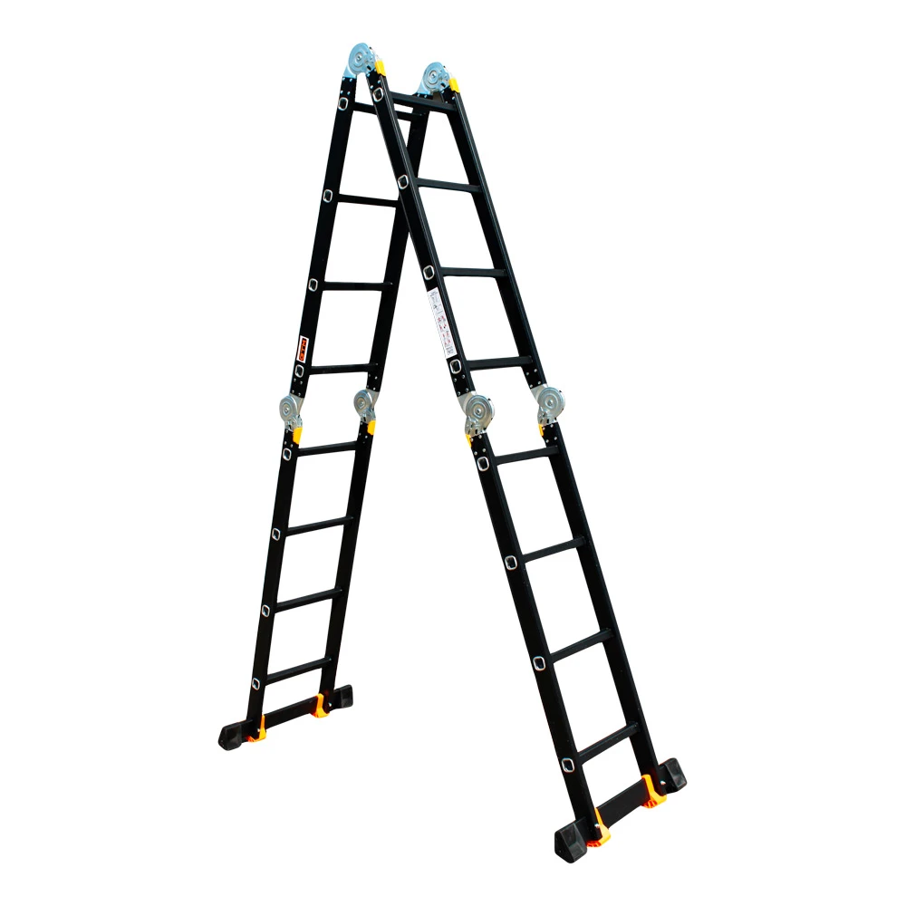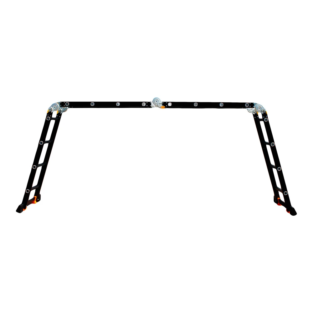 GTM KMP404A - легка драбина-трансформер підвищеної міцності, яка призначається для постійного промислового і побутового використання. Профіль виготовлений з авіаційного алюмінію, має змінну товщину стінки і додатково посилений ребрами жорсткості. Для додаткової стійкості до пошкоджень корпус пофарбований в чорний колір методом електрофорезу. Міцні шарніри і замки надійно фіксують сходи в будь-який з обраних форм. Завдяки такій конструкції трансформер GTM KMP404A здатний витримати без деформації навантаження в 150 кг.