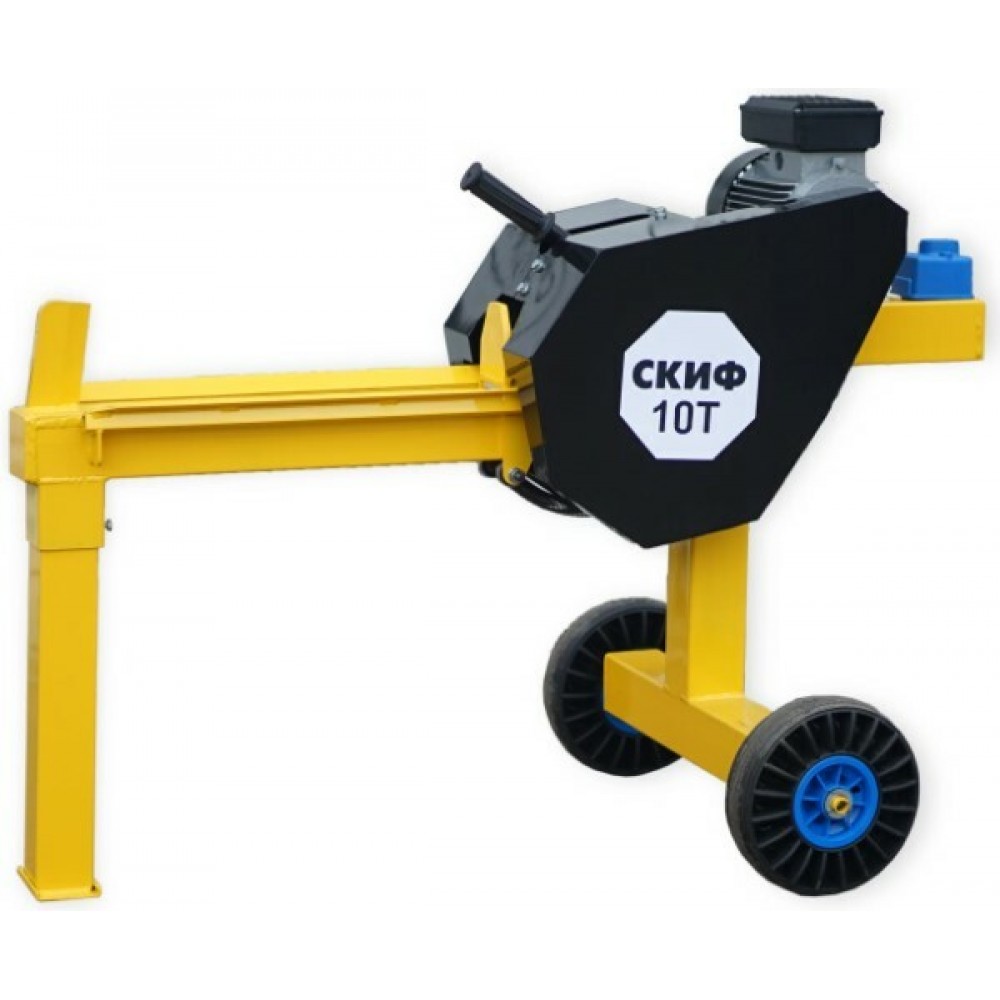 Скіф 10-Т - кінетичний рейковий дроворуб з електроприводом, призначений для швидкої та ефективної заготівлі дров на присадибних територіях, у будинках з пічною системою опалення, на кухнях з відкритим вогнем. Робочий механізм ґрунтується на кінетичній системі, яка дозволяє розколювати поліна із зусиллям до 10 тонн за одну секунду. Електродвигун адаптований для використання в побутових умовах, включаючи сільську місцевість, забезпечуючи роботу навіть за недостатньої потужності електромережі.