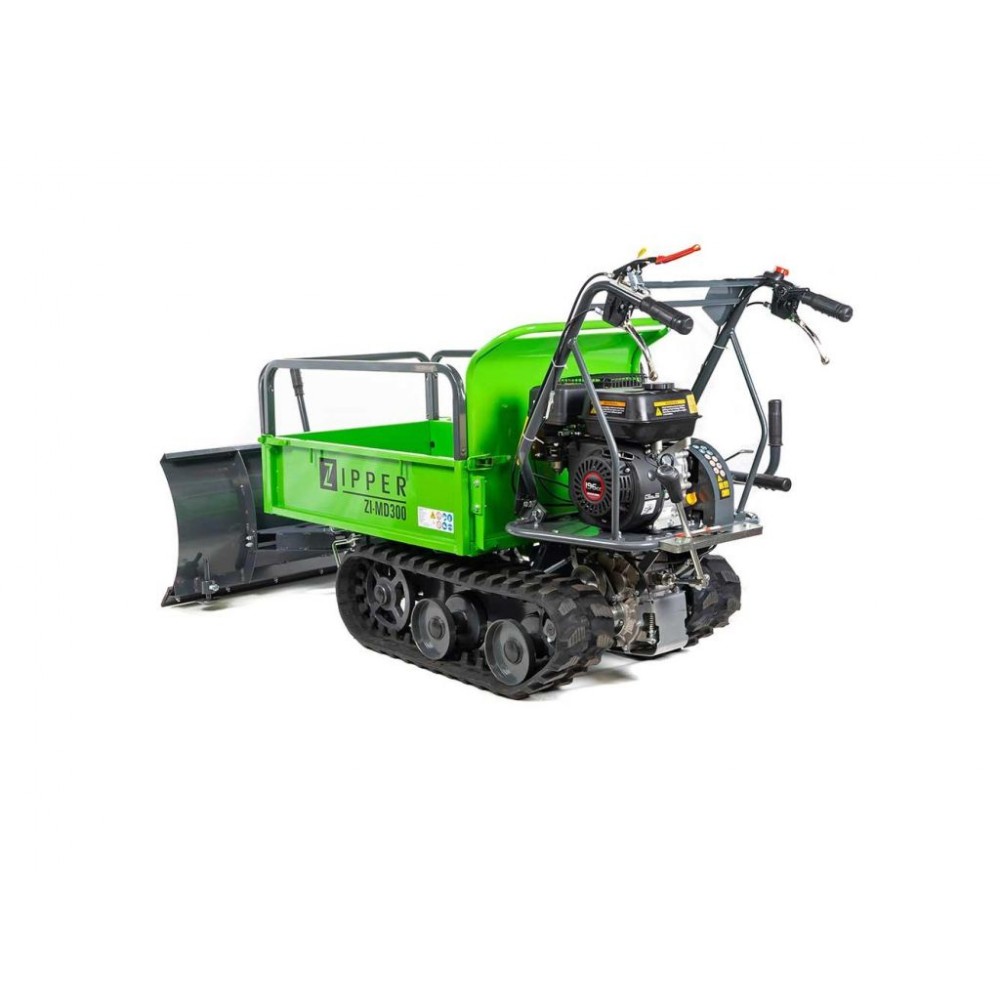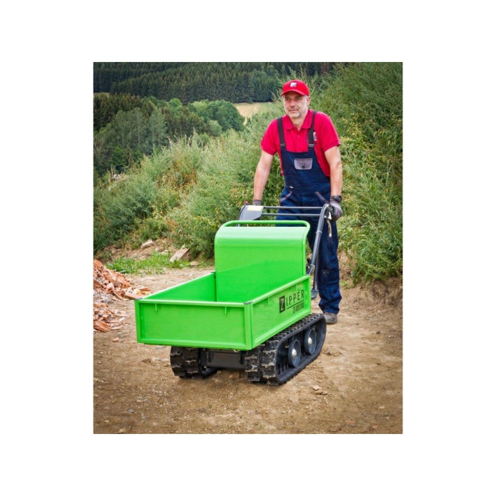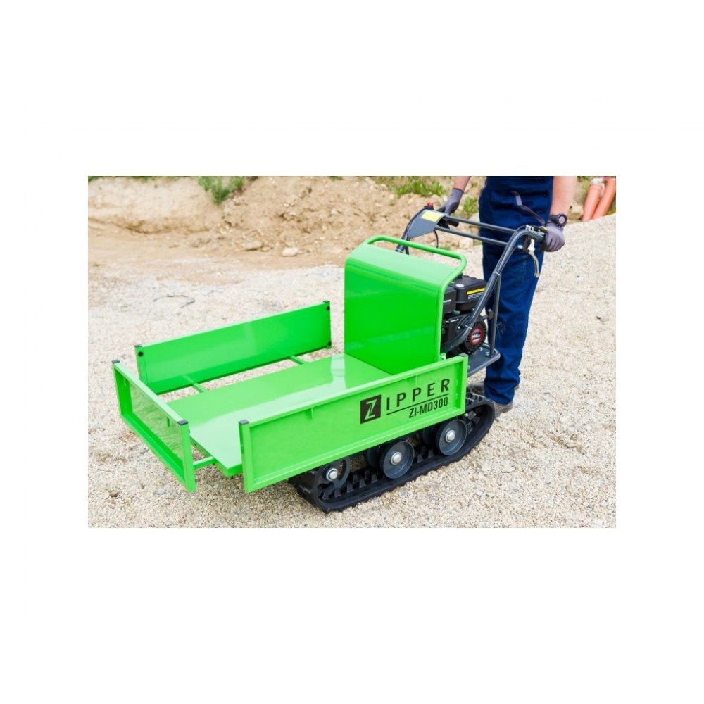 Думпер гусеничний, міні самоскид Zipper ZI-MD300 призначений для перевезення сипучих матеріалів по різних місцевостях. Відмінно впорається з транспортуванням піску, гравію, каменю, будівельного і побутового сміття вагою до 300 кг. Завдяки компактній конструкції без проблем проїжджає по вузьких доріжках і у невеликі ворота. Обладнаний бензиновим двигуном потужністю 4,1 кВт.