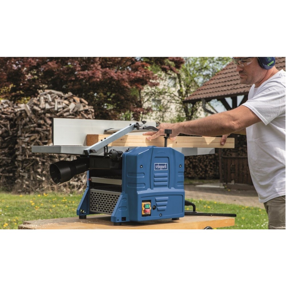 Scheppach HMS1080 - фуговально-рейсмусовий верстат високої якості. Він може використовуватись у домашніх майстернях або стати надійним помічником майстра у невеликому меблевому цеху. Завдяки йому можливе серійне виробництво абсолютно однакових деталей. При цьому їх поверхня буде абсолютно рівною і гладкою без найменшої шорсткості. Усі відходи забираються миттєво, якщо підключено пилосос.