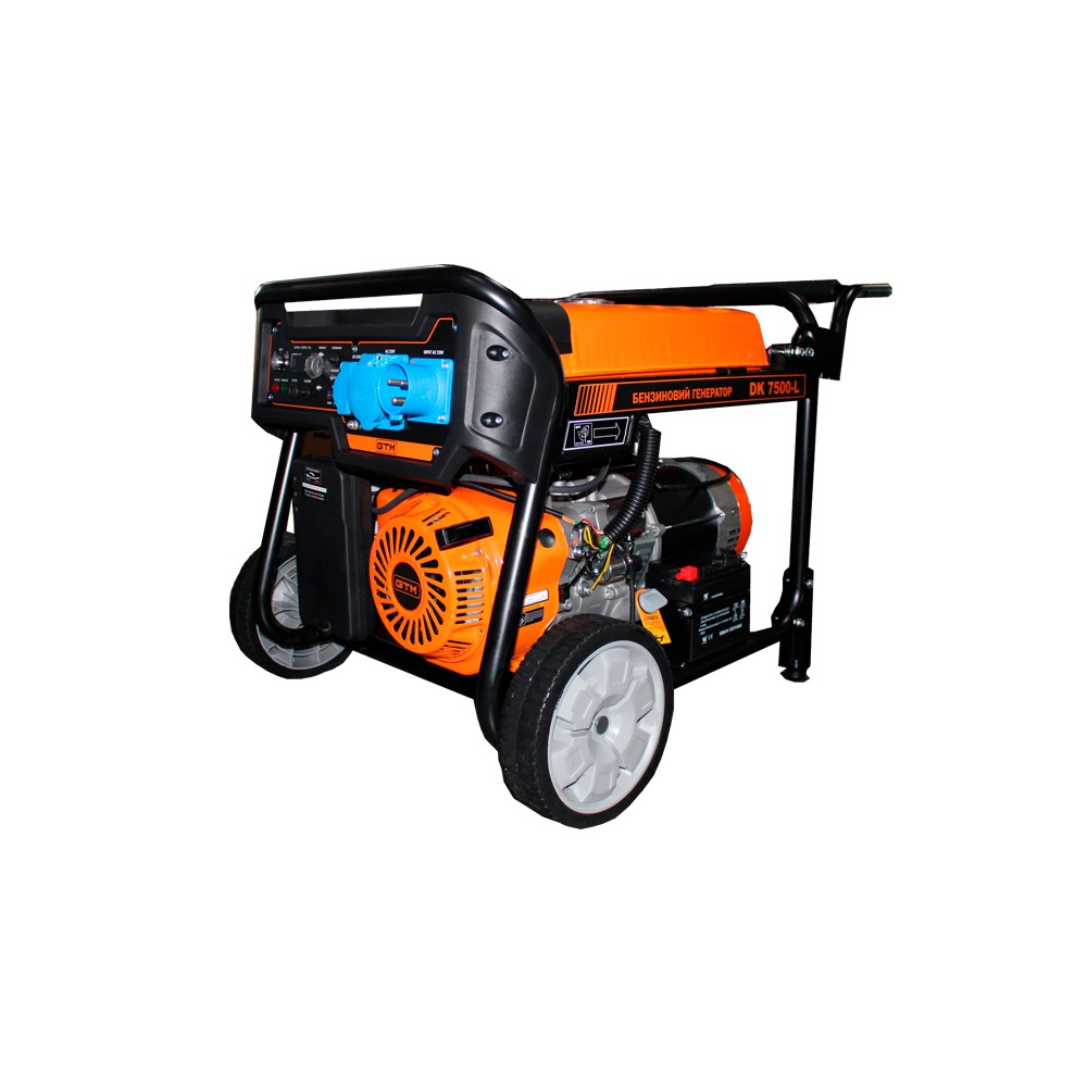 GTM DK7500-L– бензиновий електрогенератор для забезпечення живлення обладнання у разі відсутності електроенергії. Оснащений 4-х тактним двигуном DK192F, який відрізняється економічністю, низьким рівнем викидів та шуму. Максимальна потужність на виході генератора становить 7,5 кВт. Ідеальний варіант для використання у побутових умовах, на дачі або у невеликих магазинах. Під час роботи повного бака палива об'ємом 25 л вистачить до 7 годин при 100% навантаженні. Вбудований АВР дозволяє налаштувати автоматичне увімкнення генератора при відключенні мережі.