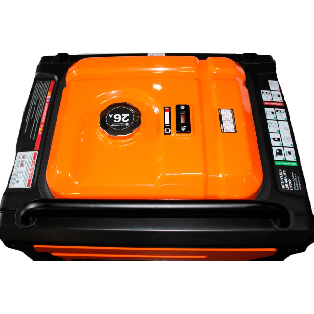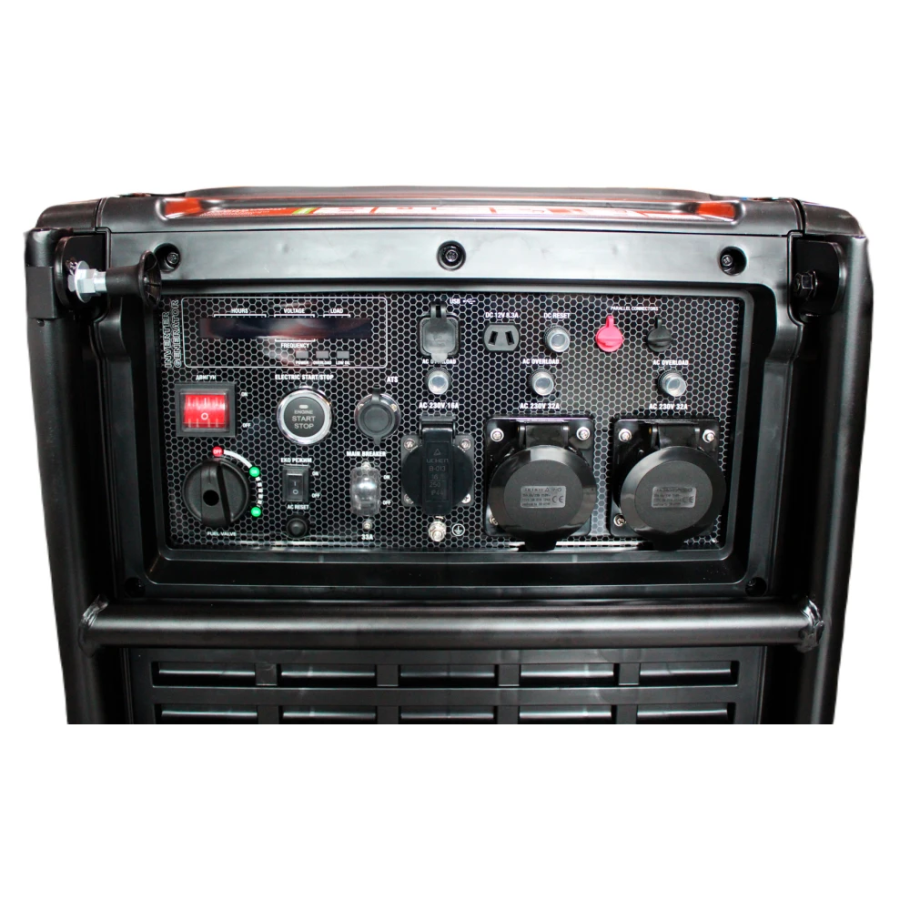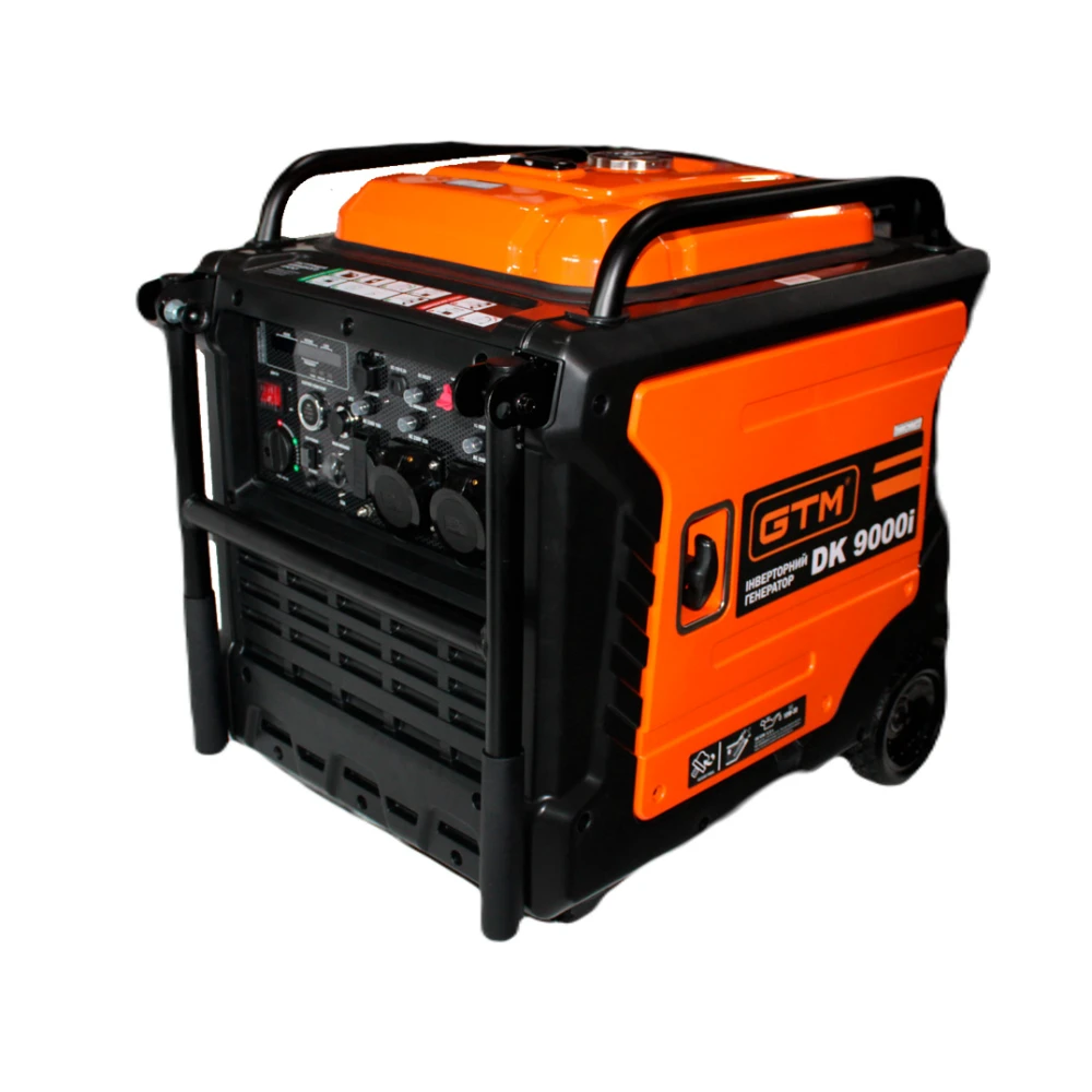 Інверторний бензиновий генератор GTM DK9000i –оснащений надійним, стійким до роботи в екстремальних умовах 4-тактним двигуном марки DK460F з максимальною потужністю на виході до 8 кВт. Ідеальний варіант, щоб зробити ваш відпочинок, похід чи риболовлю ще яскравішим та комфортнішим. Під час роботи повного бака палива об'ємом 26 л вистачить до 10.5 год при 50% навантаженні. Інверторна технологія забезпечує надійне живлення для чутливих електричних приладів та комп'ютерів. Захист при низькому рівні мастила. Зручна захищена панель. Термічний автоматичний вимикач захищає генератор від перевантаження чи перегріву.Індикатор сигналу тривоги значно спрощує контроль при використанні.