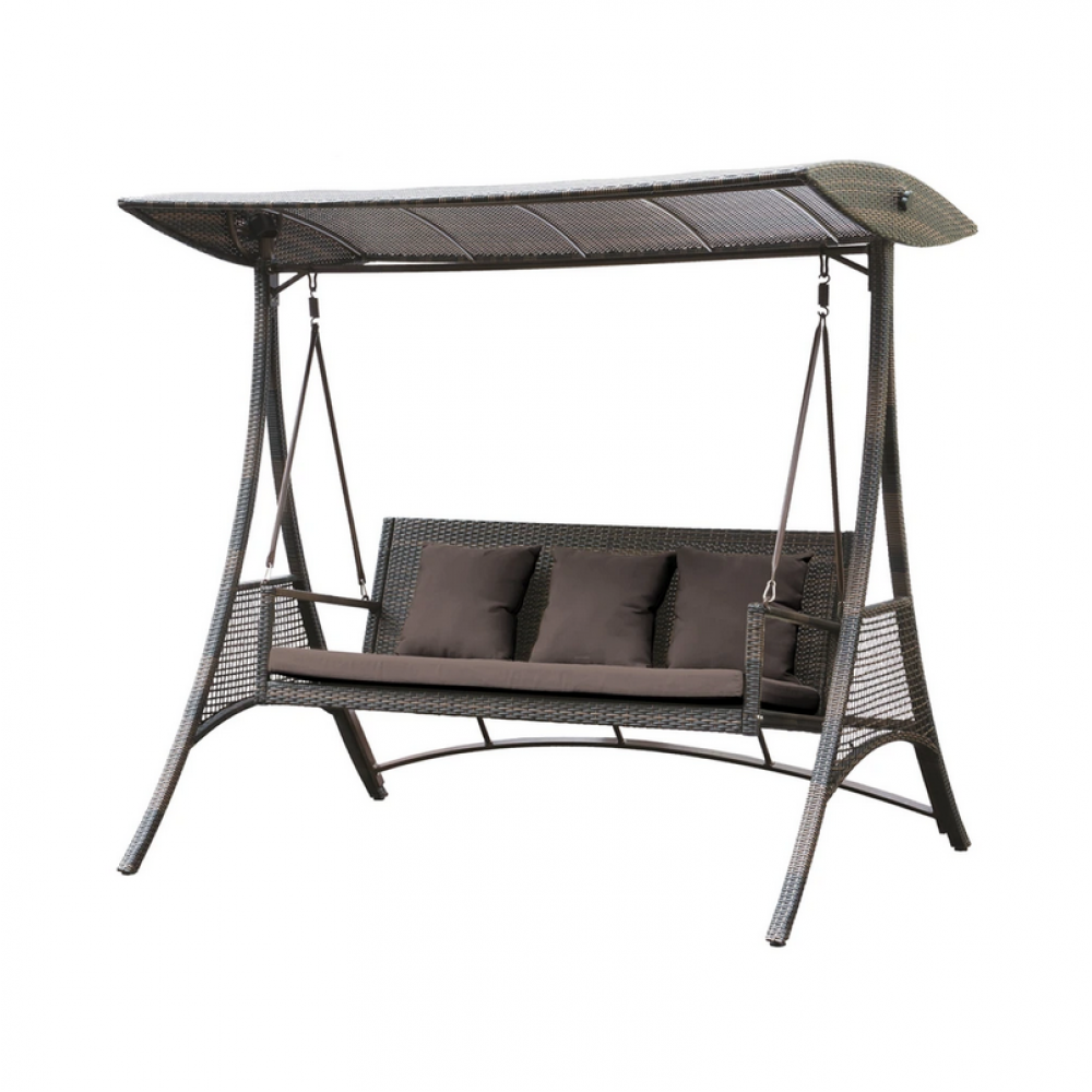 Міцна тримісна садова гойдалка з навісом, виготовлена із сталевих труб з імітацією ротанга. Лавка підвішена на гвинтових пружинах. Підходить для критих садів і використання у вологому середовищі. Подушки в комплекті. Розміри (Д x Ш x В): 128 x 210 x 195 см. Вантажопідйомність 240 кг.