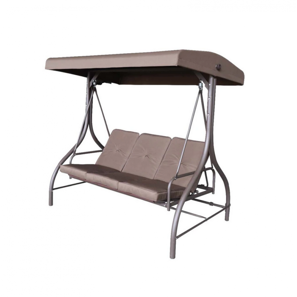 Розкішна садова гойдалка з навісом, виготовлена із сталевих труб з комакситовою обробкою поверхні. Можливість регулювання в положення лежачи. Лавка підвішена на гвинтових пружинах. Не підходить для використання у вологому середовищі. Розміри (Д x Ш x В): 130 x 185 x 170 см. Вантажопідйомність: 240 кг.