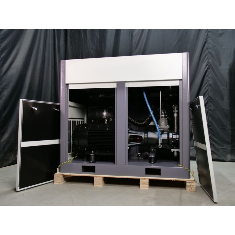 Корпус виготовлений зі стійкої до корозії і скручування товстостінної сталі і має знімні панелі для легкого доступу до внутрішніх компонентів. Завдяки якісній шумоізоляції компресор працює дуже тихо (рівень шуму - 70±2 дБ(А)), що дозволяє встановлення у виробничому приміщенні без дискомфорту для персоналу. Також цей інверторний компресор для виробництва оснащений модулем Wi-Fi, завдяки якому можна віддалено відстежувати параметри його роботи через спеціальний додаток.