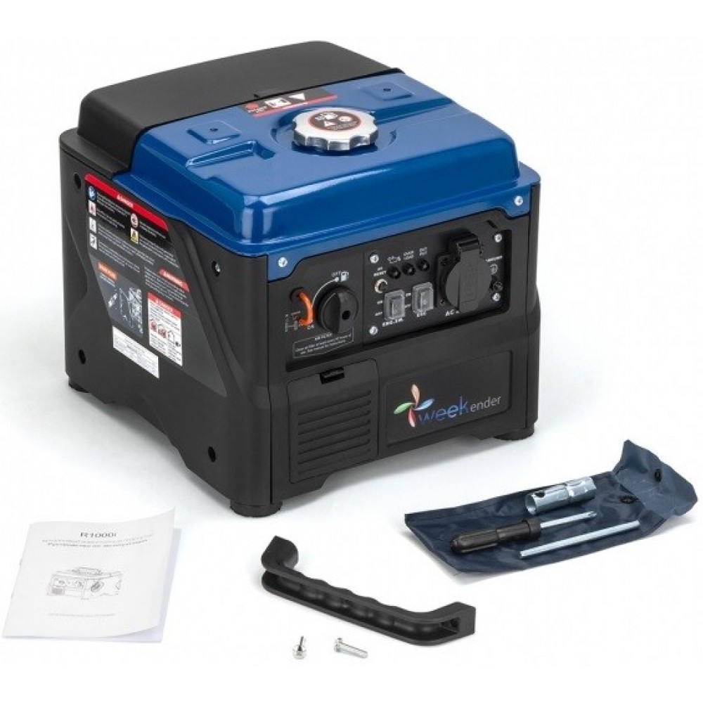 Невеликий переносний інверторний однофазний генератор Weekender Smart 1000I призначений для побутового застосування. Характеризується робочою потужністю 0.7 кВт (максимум - 1 кВт), з простим ручним пуском за допомогою тросика. Для підключення навантаження передбачено одну стандартну розетку 220В на 16А. Мобільний, дуже легкий, всього 12.5 кг, його зручно переносити, взявшись за ручку зверху. Симпатичний оригінальний дизайн для генераторів.