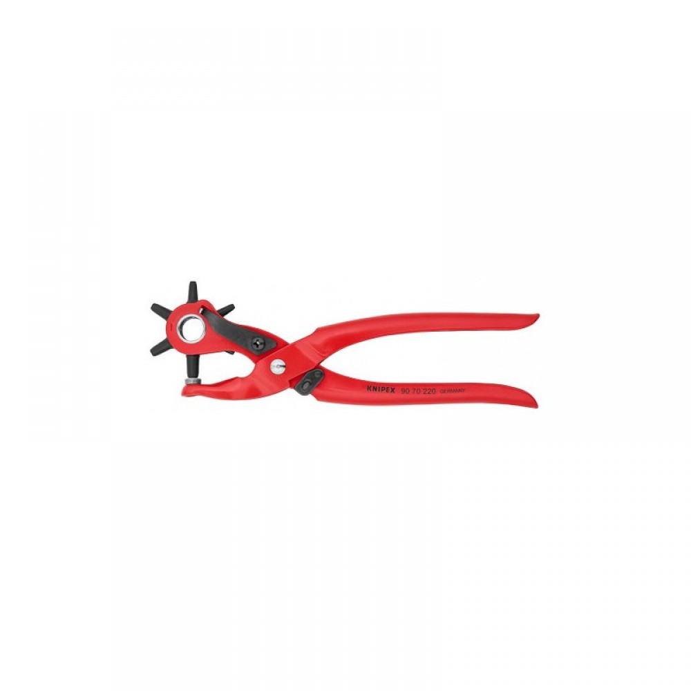 Кліщі просічні з револьверною голівкою KNIPEX 90 70 220 Вага нетто 251 g Довжина загальна 220 mm Виконання з порошковим покриттям Кліщі порошкове фарбування для просікання отворів у шкірі, текстильних матеріалах та пластмасах. з 6 змінними пуансонами, Ø 2,0/2,5/3,0/3,5/4,0/5,0 мм з розкривною пружиною та блокувальною клямкою пофарбовані порошковою фарбою для захисту від корозії корпус кліщів та пробійники: спеціальна інструментальна сталь, загартована в маслі No. 90 70 220 EAN 4003773019411 Кліщі з червоним порошковим покриттям виконання з порошковим покриттям Довжина 220 мм Вага нетто 251 g