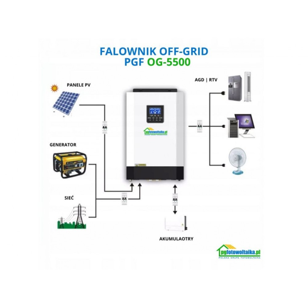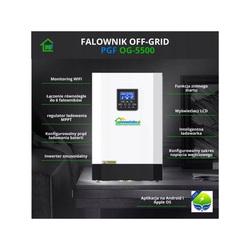 Сонячний фотоелектричний інвертор OFF-GRID PGF OG-5500 MPPT 5.5KW + WiFi є багатофункціональним інвертором та зарядним пристроєм, що поєднує в собі функції інвертора, сонячного зарядного пристрою з ШІМ (широтно-імпульсна модуляція) та зарядного пристрою для акумуляторів.