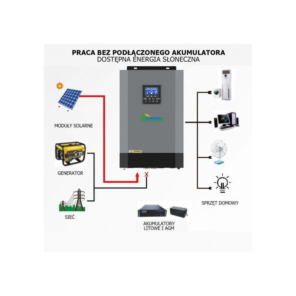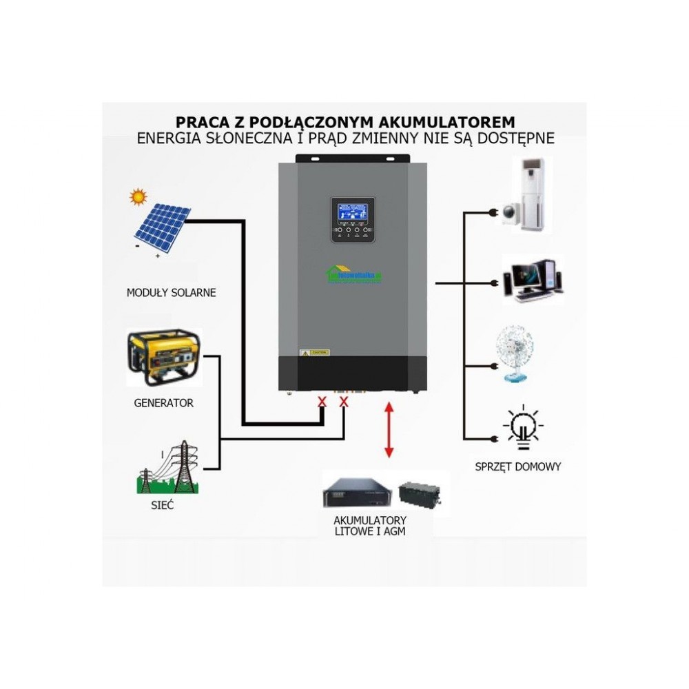 Цей інвертор забезпечує тривале безперебійне живлення електричних пристроїв, що потребують живлення 230В змінного струму, з можливістю вибору пріоритету живлення: мережа або сонячна батарея. Завдяки компактному дизайну його можна встановити навіть у невеликих приміщеннях або транспортних засобах.