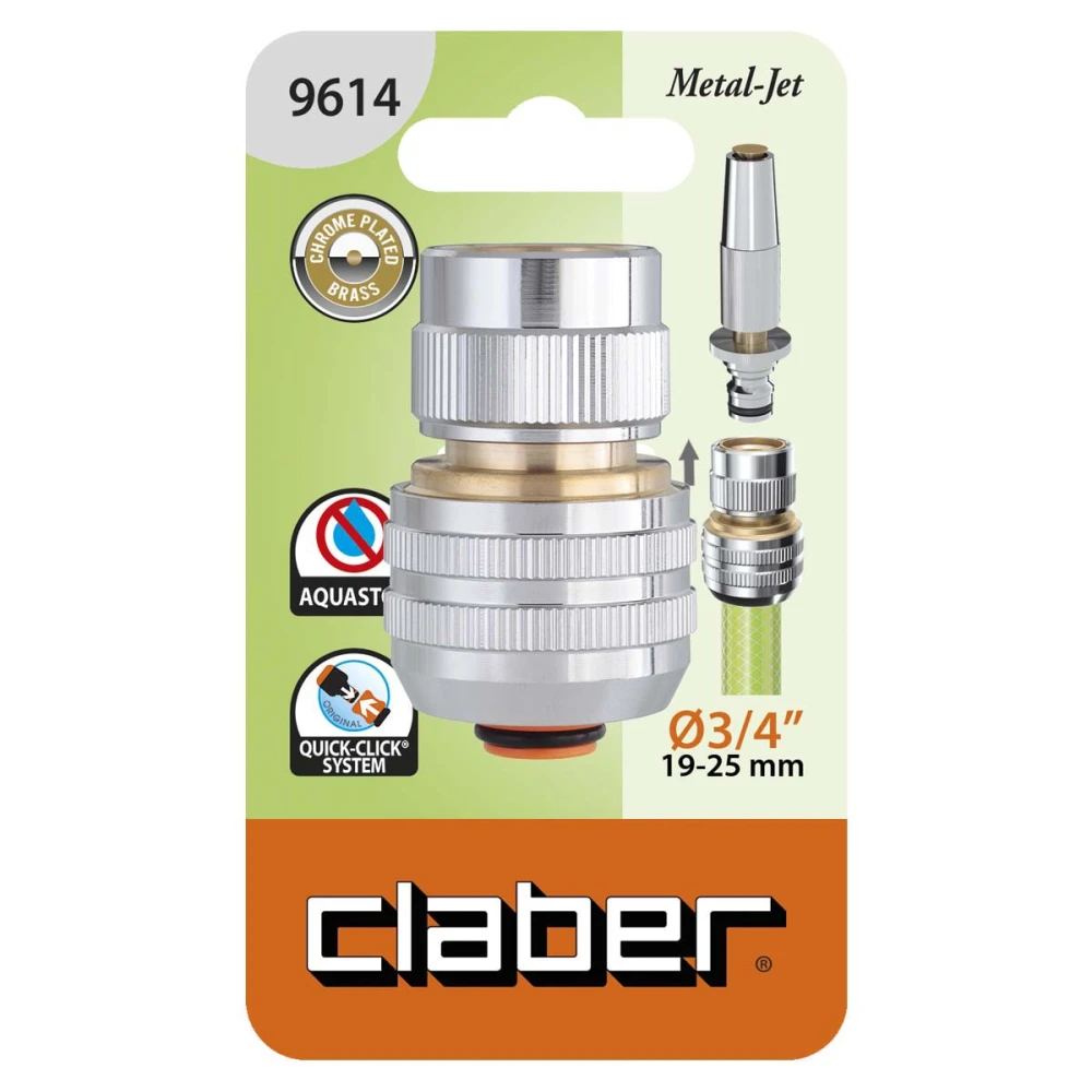 Claber Metal-Jet 9614- конектор для простого під'єднання поливального шланга до поливального пістолета або іншого з'єднання Quick-Click. З одного боку конектора є вхід для шлангів діаметром 3/4, який надійно і герметично фіксує кінець шланга. З іншого боку знаходиться швидкознімне з'єднання Quick-Click System. Завдяки такій конструкції не потрібно додаткових інструментів під час монтажу, а спеціальний дизайн дає змогу працювати навіть мокрими пальцями.
