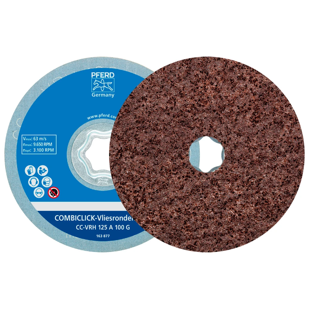 Pferd CC-VRH 125 A 100 G - твердий волоконний круг із системи Combiclick для універсальних робіт на металевих поверхнях середнього та великого розміру, наприклад, для видалення слідів грубого шліфування, видалення окиснювачів і легких робіт з видалення задирок. Цей розхідник дає змогу отримати матові та сатиновані поверхні.