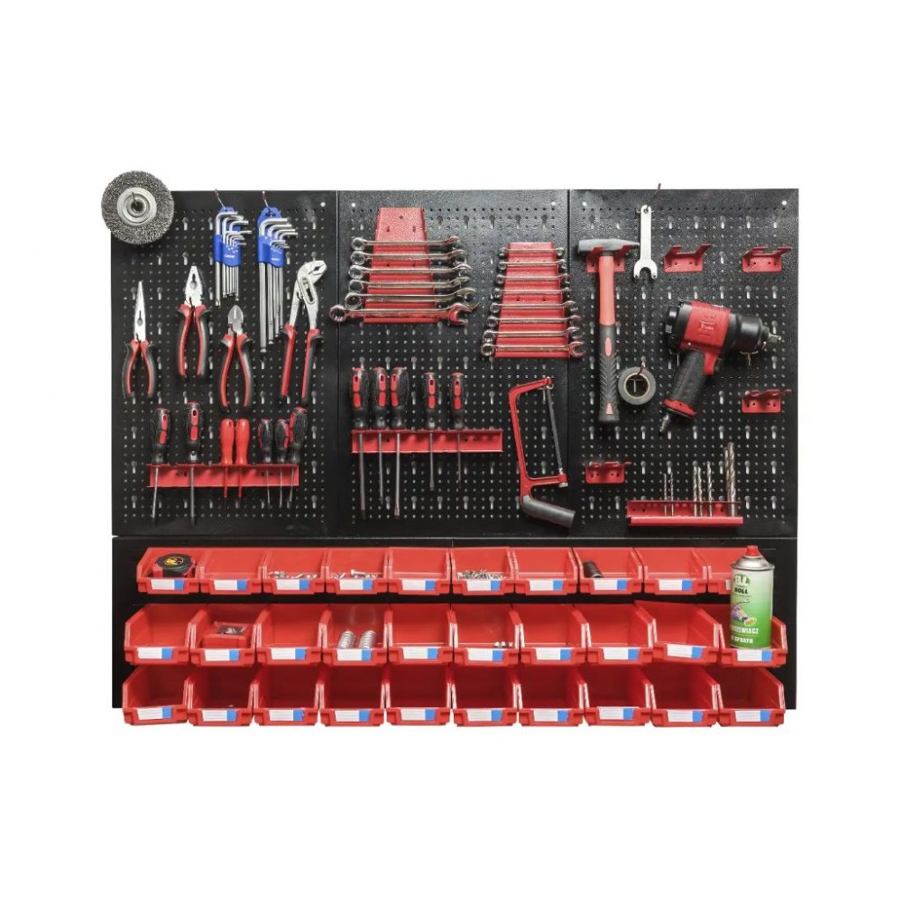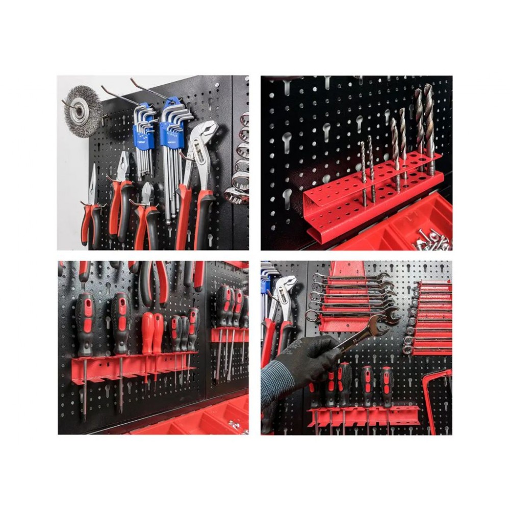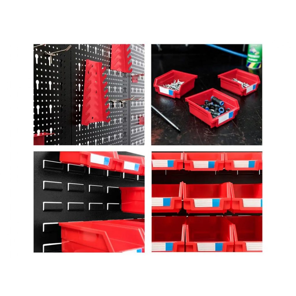 Комплектується 30 пластиковими контейнерами зі спеціальними стікерами, тому ви можете розсортувати інструмент так, як вам зручно, і підписати наповнення кожного ящика для швидкого знаходження потрібного предмета. 22 металеві вішалки різного розміру і форми дозволяють компактно закріпити різноманітний інструмент на стелажі. Завдяки своїй універсальності і зручності, така дошка для інструменту відмінно доповнить як майстерню, так і власний гараж.