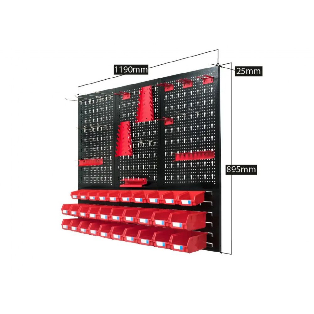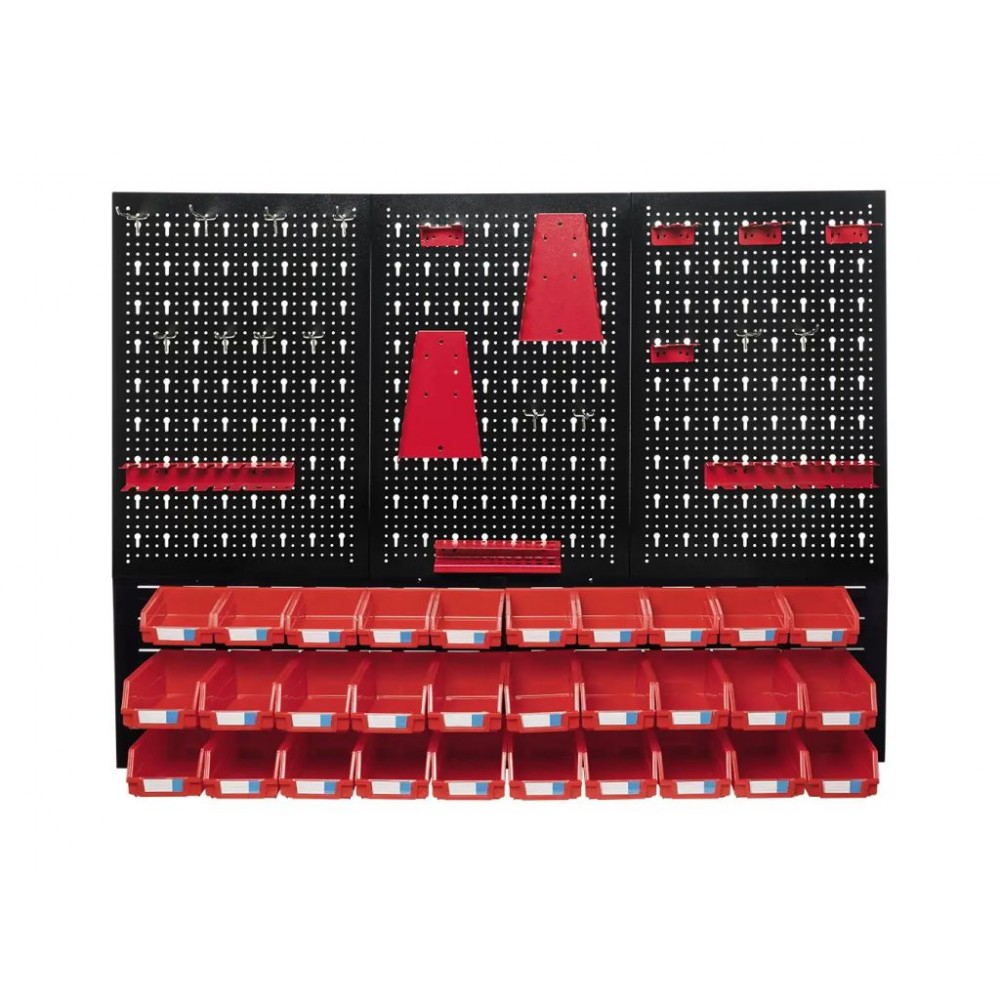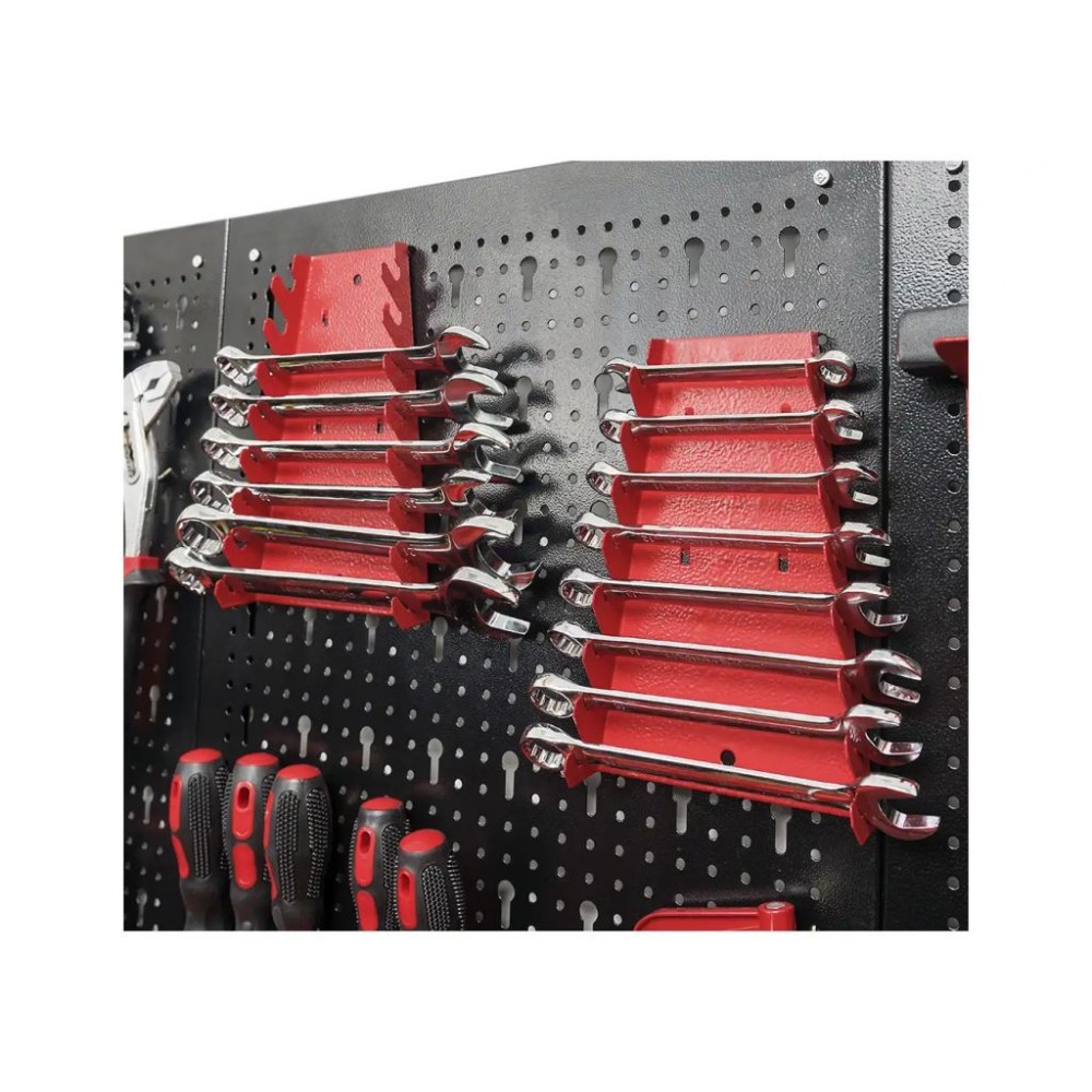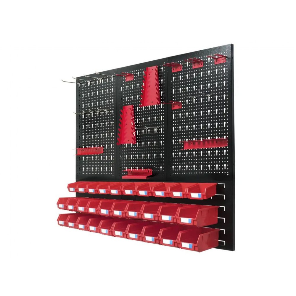 Комплектується 30 пластиковими контейнерами зі спеціальними стікерами, тому ви можете розсортувати інструмент так, як вам зручно, і підписати наповнення кожного ящика для швидкого знаходження потрібного предмета. 22 металеві вішалки різного розміру і форми дозволяють компактно закріпити різноманітний інструмент на стелажі. Завдяки своїй універсальності і зручності, така дошка для інструменту відмінно доповнить як майстерню, так і власний гараж.