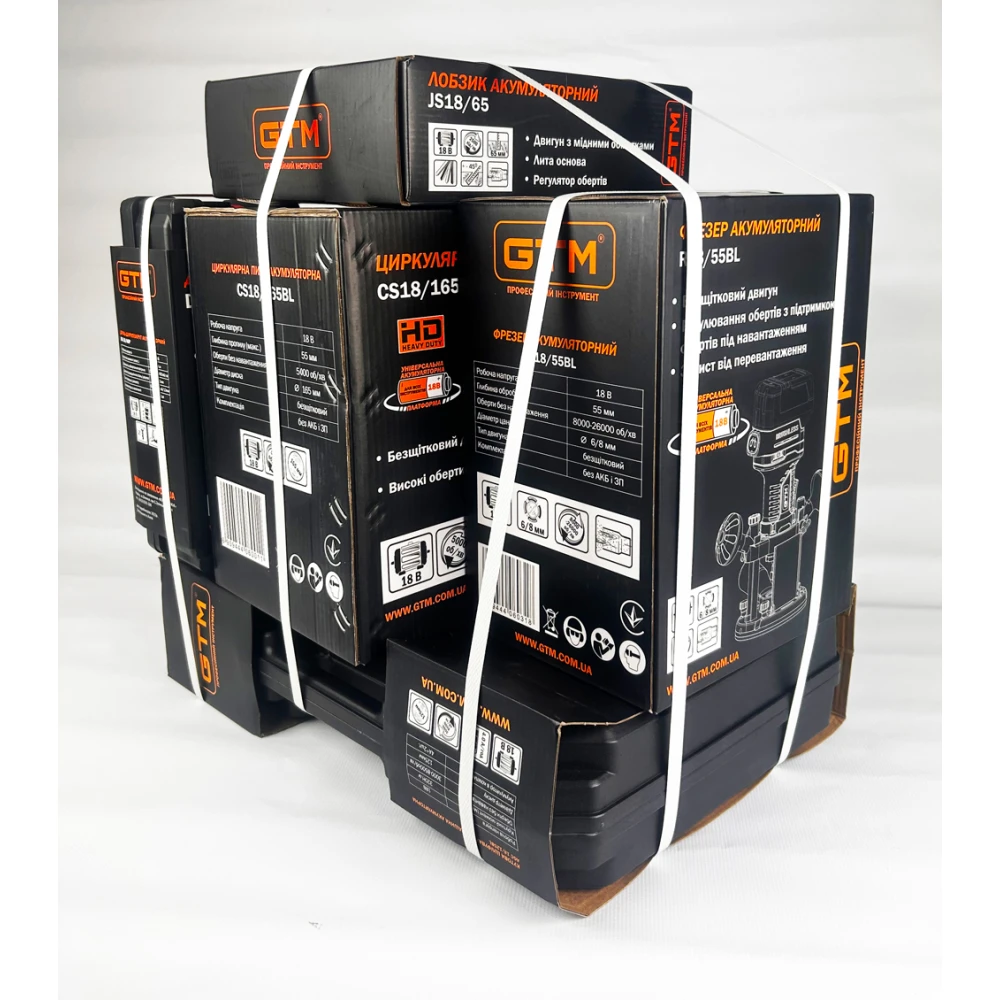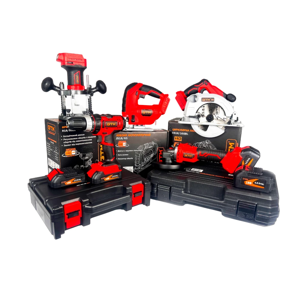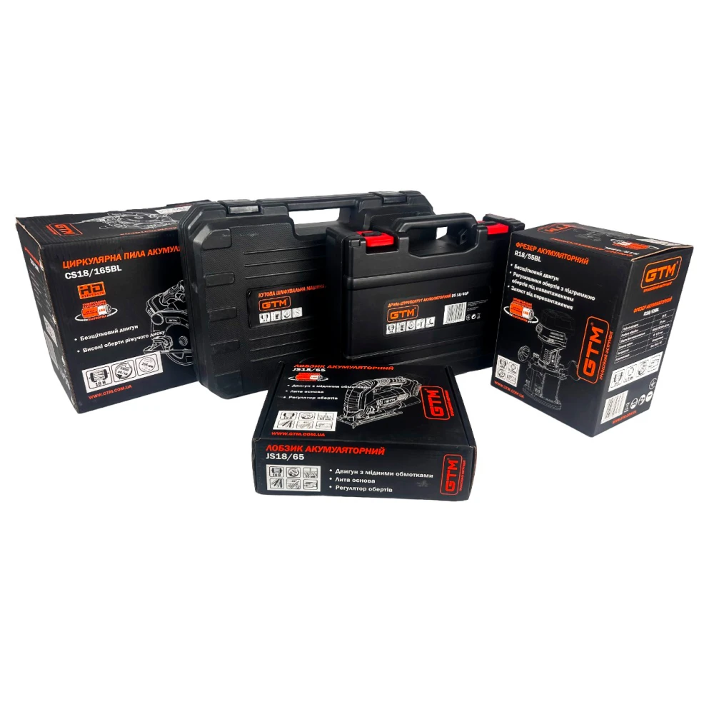 Опис Набір акумуляторного інструменту GTM 18V шурупокрут + КШМ + лобзик + циркулярна пила + фрезер + 4 АКБ і ЗП (PROMO_4)
