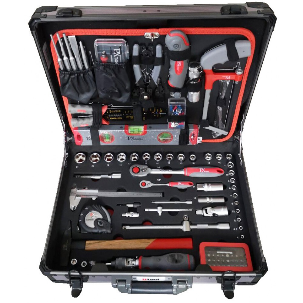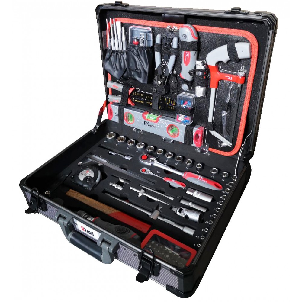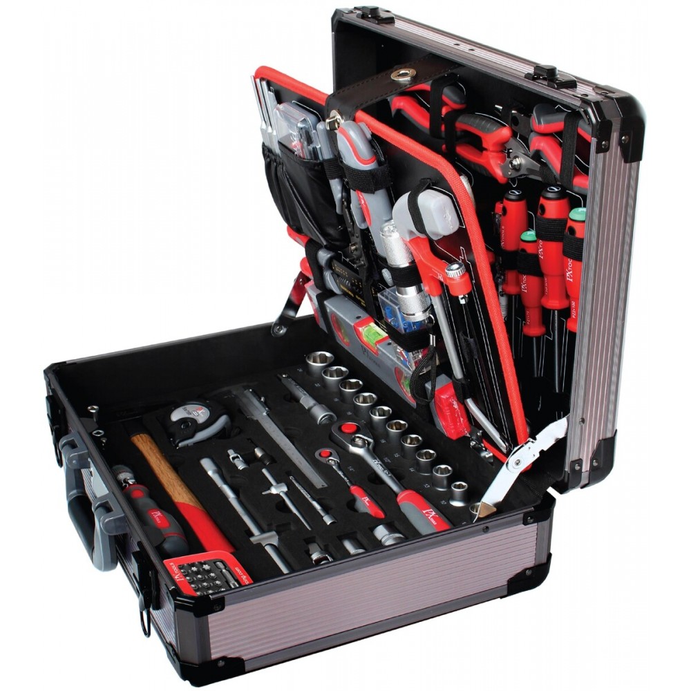 - Бокорізи (160 мм, "S55C POL");- плоскогубці з довгим носиком (160 мм, S55C);- Плоскогубці комбіновані (160 мм, «S55C»);- кліщі переставні (250 мм, S55C);- пінцет (велика голівка: 200 мм);- ручна храпова рукоятка («1/4 CrV», 72 зубчики);- ручна храпова рукоятка («1/2 CrV», 72 зубчики);- викрутка ("PZ", 1х75 мм, "CrV");- викрутка ("PZ", 2х100 мм, "CrV");- викрутка шліцева ("SL", 1х5.5х75 мм, "CrV");- викрутка шліцева (SL, 1.2х6.5х100 мм, CrV);- викрутка "PH1 CrV", 3 шт. (110 мм, у пластиковійкоробці);- Комбіновані ключі, 8 шт. (8 мм, 10 мм,11 мм, 12 мм, 13 мм, 14 мм, 17 мм, 19 мм);- Розвідний ключ (250 мм);- Кернер, 5 шт.;- чим (18 мм, "SK5", картриджі для лез: 8 шт.);- Вимірювальна поверхня (точність: 1 мм/м);- молоток (300 г, "CS", дерев'яна ручка);- Ножиці (180 мм);- вольтметр (100-250 В);- напилок (200 мм, "CS");- плоскогубці зі змінною головкою, 4 головки;- міні-ліхтар (LFL 15-9);- ножівка (160 мм, CS mini);- Набір полотен, 4шт. (ножовка: 160 мм, CS mini);- обтискний інструмент (220 мм);- клемники (у пластиковій коробці);- Набір шестигранних ключів «CrV», 9 шт. (1.5 мм,2 мм, 2.5 мм, 3 мм, 4 мм, 5 мм, 6 мм, 8 мм, 10 мм);- каверномір (150 мм, "CS", точність: 0.02 мм);- головка торцева "SOK 6 1/4 CrV MAT", 13 шт. (4 мм,4.5 мм, 5 мм, 5.5 мм, 6 мм, 7 мм, 8 мм, 9 мм, 10 мм,11 мм, 12 мм, 13 мм, 14 мм);- головка торцева "SOK 6 1/2 CrV MAT", 10 шт.(10 мм, 13 мм, 14 мм, 15 мм, 16 мм, 17 мм, 18 мм,19 мм, 22 мм, 24 мм);- торцевий ключ "1/2 CrV MAT", 2 шт. (125 мм, 250 мм);- торцевий ключ "1/4 CrV MAT", 3 шт. (50 мм, 100 мм,114 мм);- шарнір "1/4 CrV MAT";- шарнір "1/2 CrV MAT";- свічка запалювання "1/2 CrV MAT", 2 шт. (16 мм, 21 мм);- гніздовий адаптер "1/4 - 1/4";- магнітний утримувач біт («1/4»);- Утримувач біт, 2 шт. («1/4» із шарніром, «1/4 CrV»)реверсивний);- Набір біт, 31 шт. («S2»);- металевий кейс