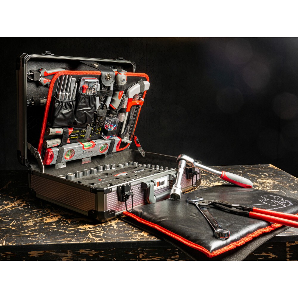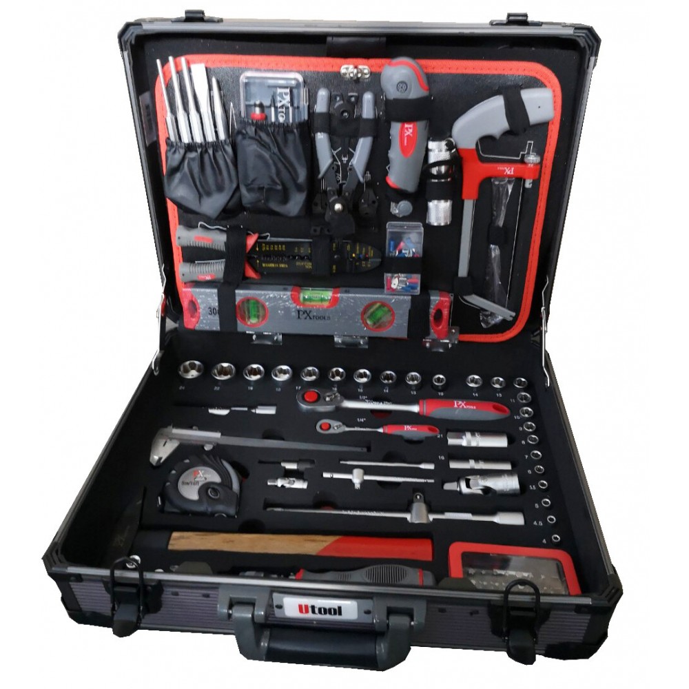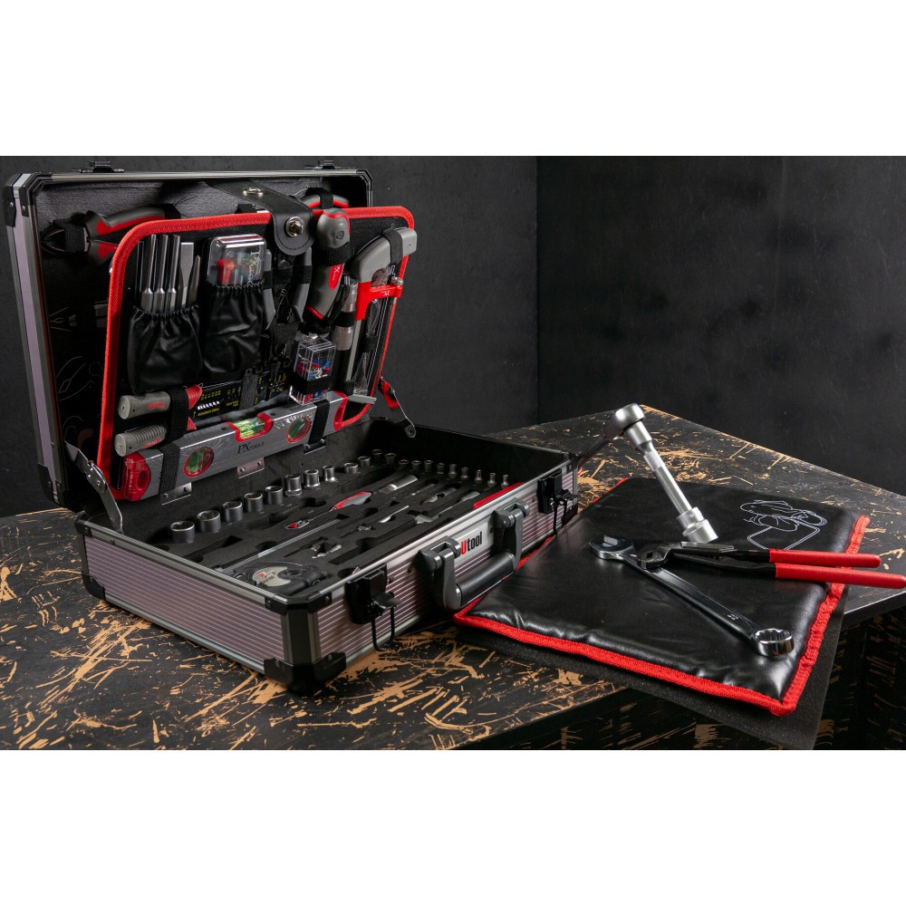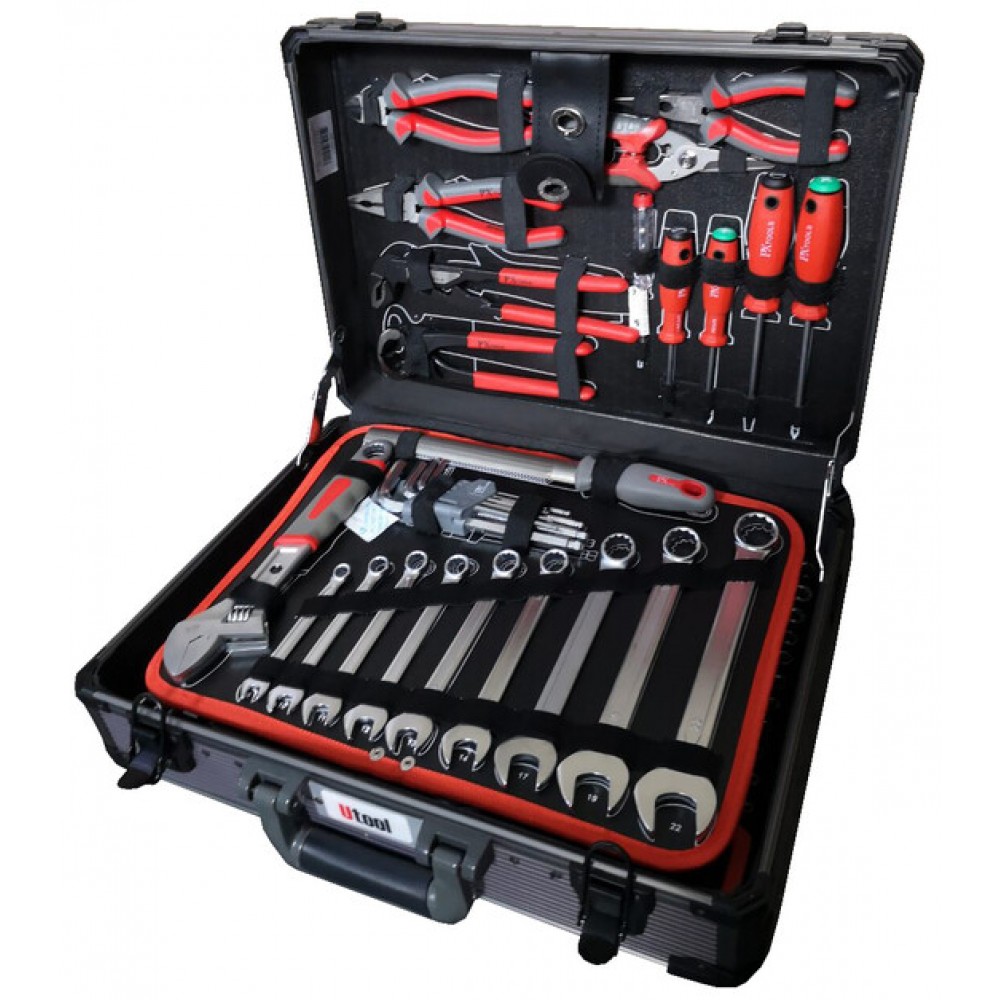 - Бокорізи (160 мм, "S55C POL");- плоскогубці з довгим носиком (160 мм, S55C);- Плоскогубці комбіновані (160 мм, «S55C»);- кліщі переставні (250 мм, S55C);- пінцет (велика голівка: 200 мм);- ручна храпова рукоятка («1/4 CrV», 72 зубчики);- ручна храпова рукоятка («1/2 CrV», 72 зубчики);- викрутка ("PZ", 1х75 мм, "CrV");- викрутка ("PZ", 2х100 мм, "CrV");- викрутка шліцева ("SL", 1х5.5х75 мм, "CrV");- викрутка шліцева (SL, 1.2х6.5х100 мм, CrV);- викрутка "PH1 CrV", 3 шт. (110 мм, у пластиковійкоробці);- Комбіновані ключі, 8 шт. (8 мм, 10 мм,11 мм, 12 мм, 13 мм, 14 мм, 17 мм, 19 мм);- Розвідний ключ (250 мм);- Кернер, 5 шт.;- чим (18 мм, "SK5", картриджі для лез: 8 шт.);- Вимірювальна поверхня (точність: 1 мм/м);- молоток (300 г, "CS", дерев'яна ручка);- Ножиці (180 мм);- вольтметр (100-250 В);- напилок (200 мм, "CS");- плоскогубці зі змінною головкою, 4 головки;- міні-ліхтар (LFL 15-9);- ножівка (160 мм, CS mini);- Набір полотен, 4шт. (ножовка: 160 мм, CS mini);- обтискний інструмент (220 мм);- клемники (у пластиковій коробці);- Набір шестигранних ключів «CrV», 9 шт. (1.5 мм,2 мм, 2.5 мм, 3 мм, 4 мм, 5 мм, 6 мм, 8 мм, 10 мм);- каверномір (150 мм, "CS", точність: 0.02 мм);- головка торцева "SOK 6 1/4 CrV MAT", 13 шт. (4 мм,4.5 мм, 5 мм, 5.5 мм, 6 мм, 7 мм, 8 мм, 9 мм, 10 мм,11 мм, 12 мм, 13 мм, 14 мм);- головка торцева "SOK 6 1/2 CrV MAT", 10 шт.(10 мм, 13 мм, 14 мм, 15 мм, 16 мм, 17 мм, 18 мм,19 мм, 22 мм, 24 мм);- торцевий ключ "1/2 CrV MAT", 2 шт. (125 мм, 250 мм);- торцевий ключ "1/4 CrV MAT", 3 шт. (50 мм, 100 мм,114 мм);- шарнір "1/4 CrV MAT";- шарнір "1/2 CrV MAT";- свічка запалювання "1/2 CrV MAT", 2 шт. (16 мм, 21 мм);- гніздовий адаптер "1/4 - 1/4";- магнітний утримувач біт («1/4»);- Утримувач біт, 2 шт. («1/4» із шарніром, «1/4 CrV»)реверсивний);- Набір біт, 31 шт. («S2»);- металевий кейс