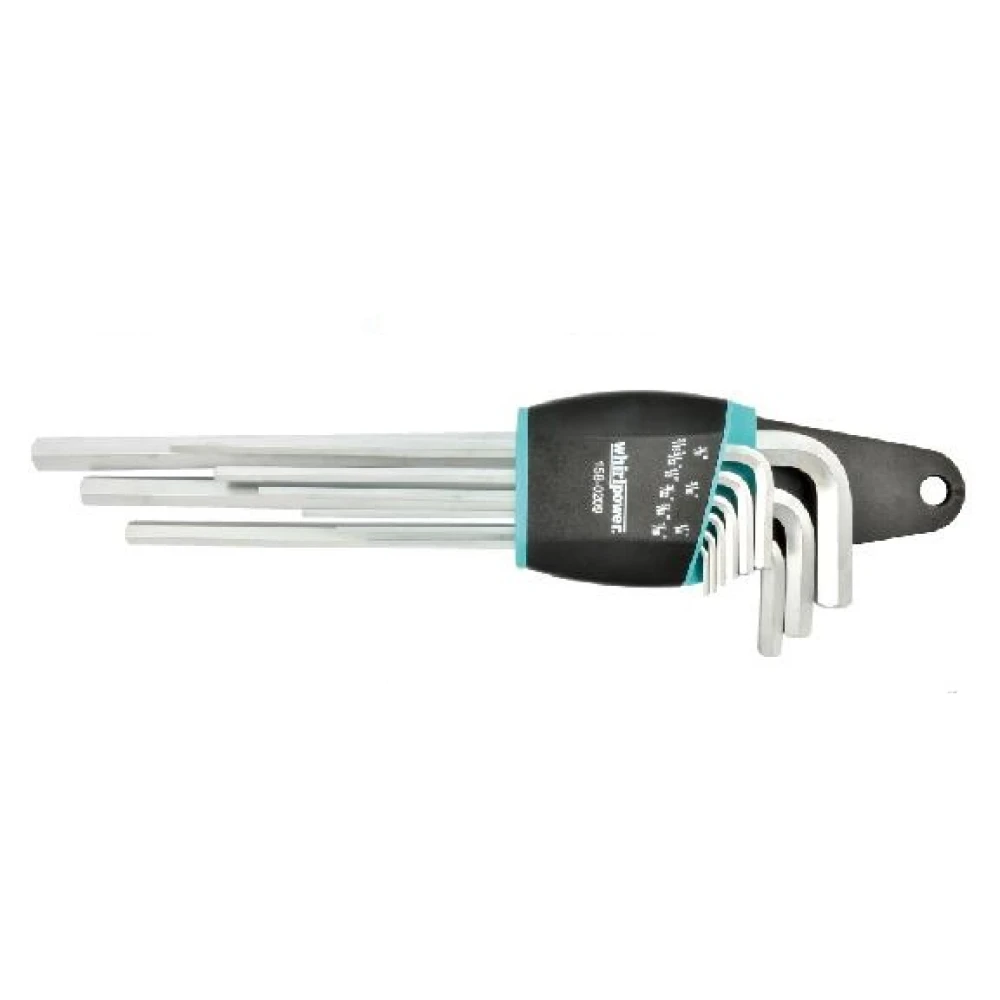 Whirlpower 158-0209- набір, що складається з 9 Г-подібних подовжених дюймових ключів для закручування/викручування болтів із шестигранними шліцами типу Hex. Такий тип наконечників дозволяє досягти більш високого моменту, що крутить, ніж при використанні плоских або хрестоподібних шліців.
