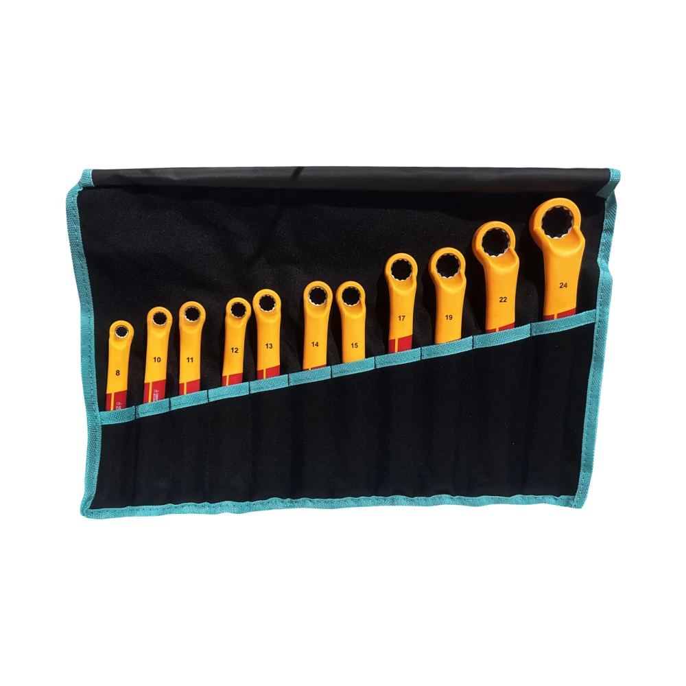 Whirlpower V243-0111- набір з 11 накидних ключів з діелектричним покриттям для закручування/викручування болтів, гайок та інших різьбових з'єднань в електрообладнанні або під напругою. Набір має сертифікацію VDE і розрахований на напругу постійного струму 1000 В.