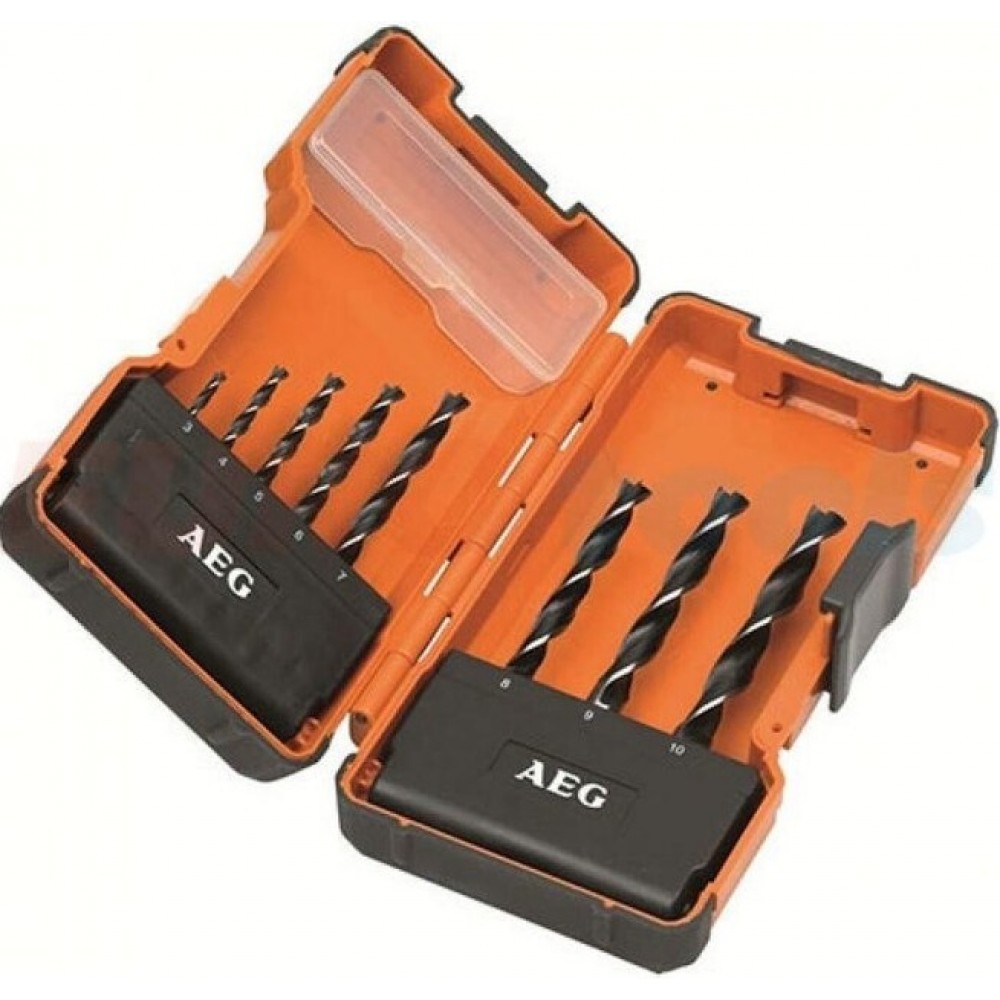 Представленный комплект включает 8 сверл, которые поставляются в эргономичном пластиковом футляре. Аксессуары спирального типа характеризуются диаметром от 3 до 10 мм, изготовлены из прочного материала. Их основным предназначением является высверливание отверстий в деревянных заготовках.