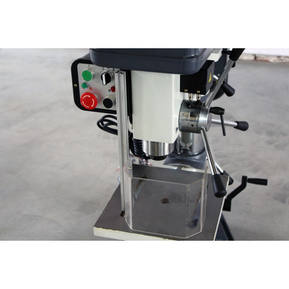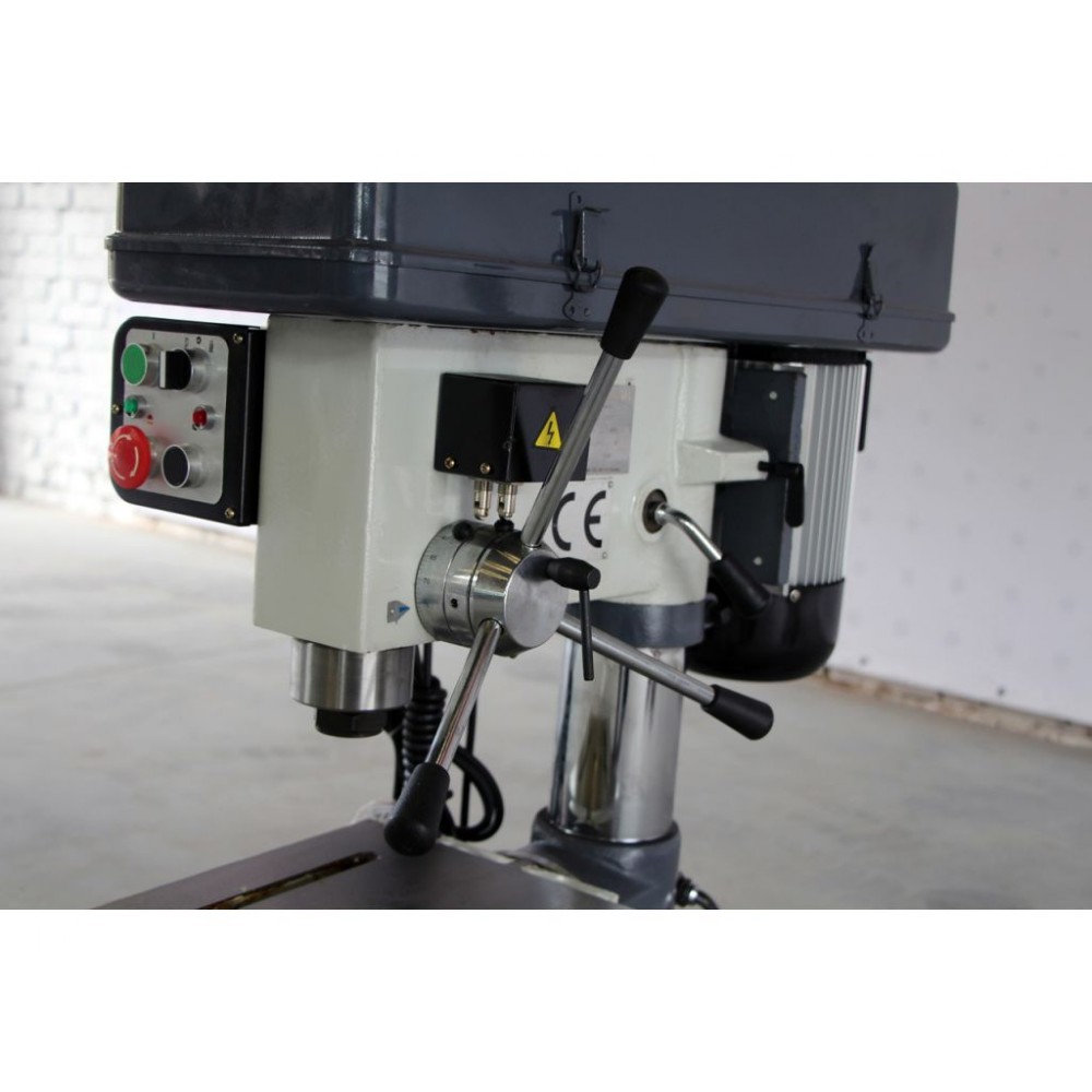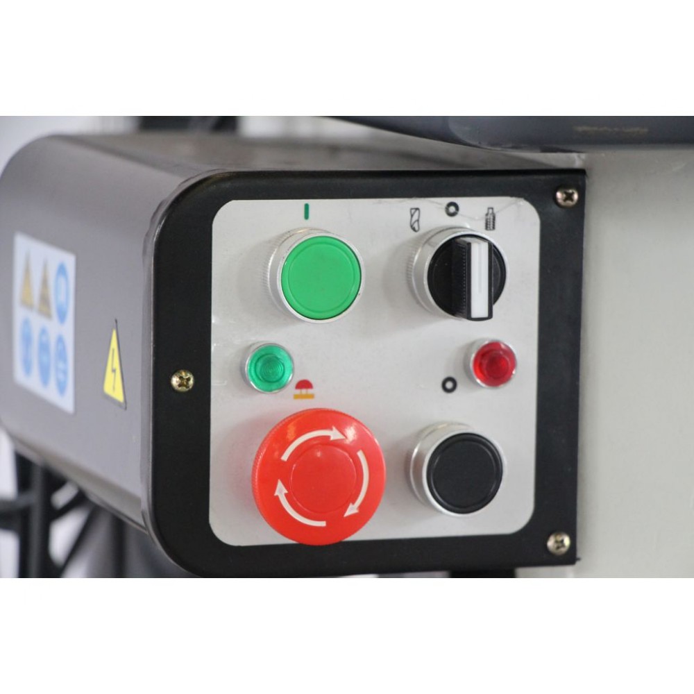 Верстат обладнаний системами безпеки відповідно до європейських норм. Кнопка аварійного вимкнення з самоблокуванням, для зупинки верстату при небезпечних ситуаціях. Відкидна кришка шпинделю яка захищає оператора, при піднятій кришці верстат не запуститься. На робочому столі є Т-подібні пази що допомагають зафіксувати деталь або дозволяють встановити додаткові фіксуючі елементи, такі як лещата.