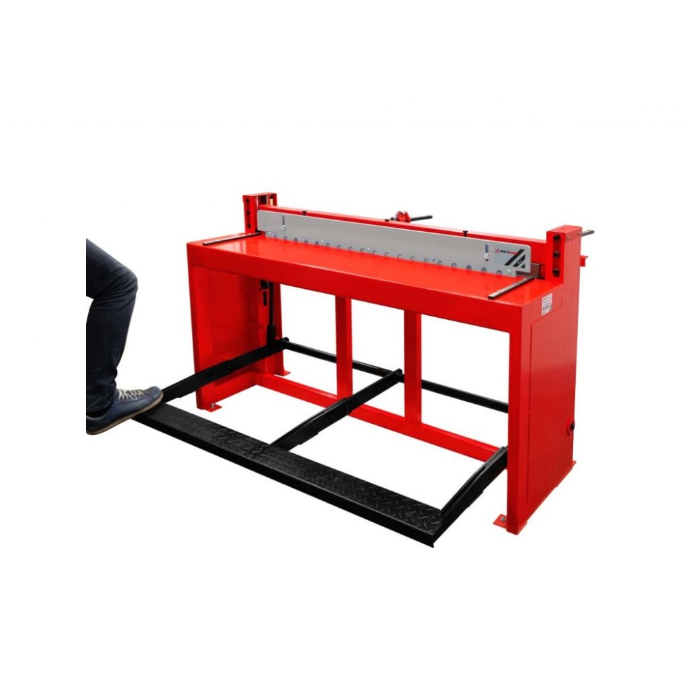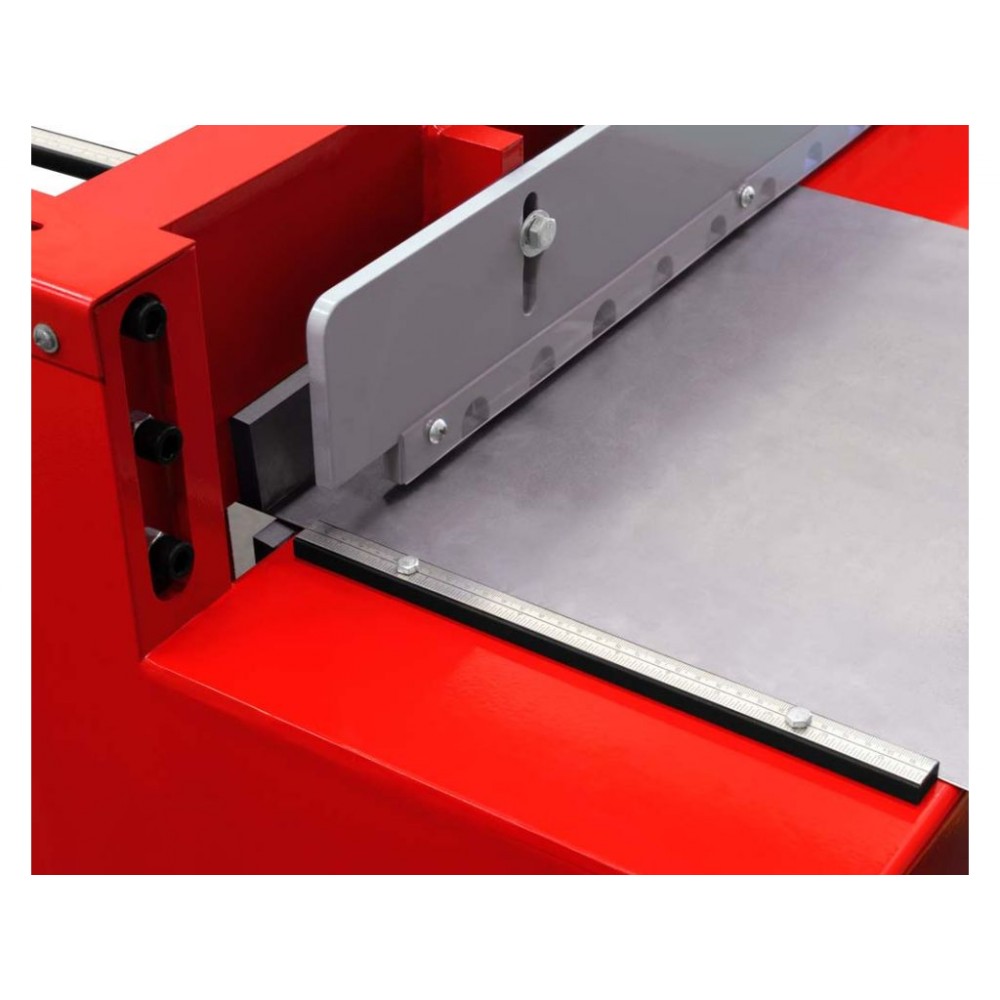 Фіксація листів відбувається за допомогою автоматичного притискного пристрою, задній упор допомагає точно позиціонувати заготовку. Є обмежувач глибини подачі до 900 мм з міліметровою шкалою. Конструкція має високу жорсткість і міцність, що дозволяє працювати з максимальною точністю і гарантує великий робочий ресурс обладнання. Модель пройшла сертифікацію за стандартами СЄ. Такий механічний гільйотинний різак буде ефективним для невеликих майстерень і виробництв.