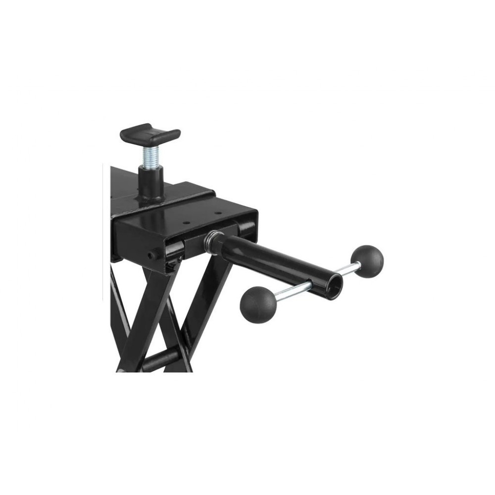 Пристрій дозволяє піднімати мотоцикл 2 способами: знизу з використанням гумової накладки і за раму за допомогою спеціальних кронштейнів. Підйом виконується за допомогою ножичного механізму і керується обертанням гвинта. Конструкція виготовлена з міцної сталі з антикорозійним покриттям і має високу стійкість до скручування і пошкоджень. Може встановлюватися на будь-якій твердій, рівній поверхні. Невеликий розмір і вага 14 кг забезпечують легке транспортування, а компактність у складеному вигляді дозволяє зручно зберігати цей домкрат для мотоциклів.