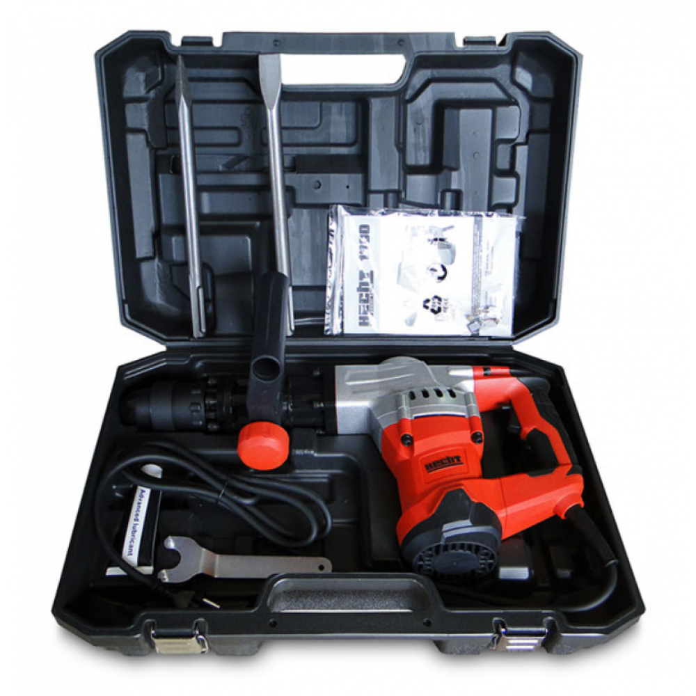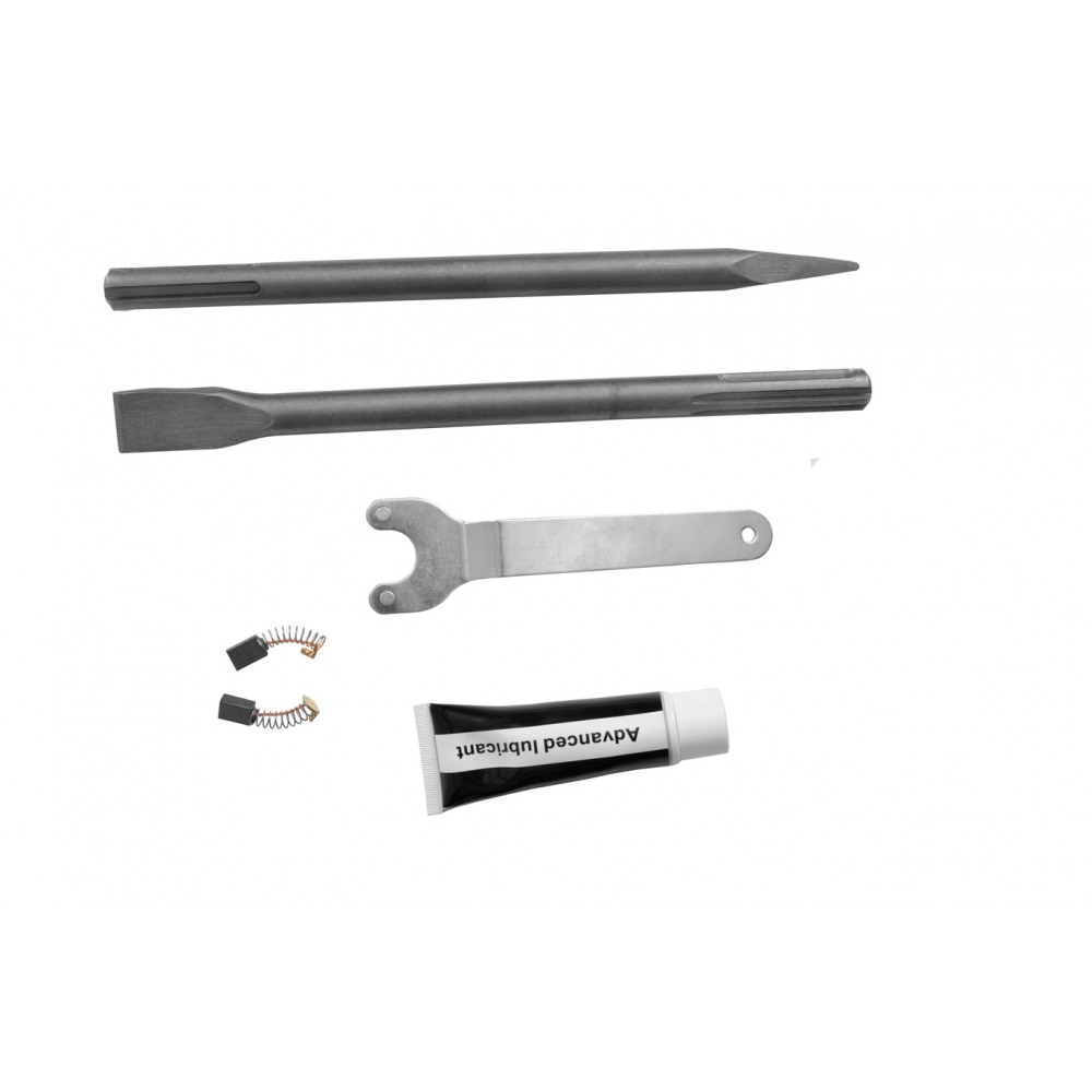 - Комплект постачання: В комплект входять загострене долото, плоске долото, мастило, сервісний ключ, дві вугільні щітки та транспортний кейс, що забезпечує готовність до роботи зразу після придбання.