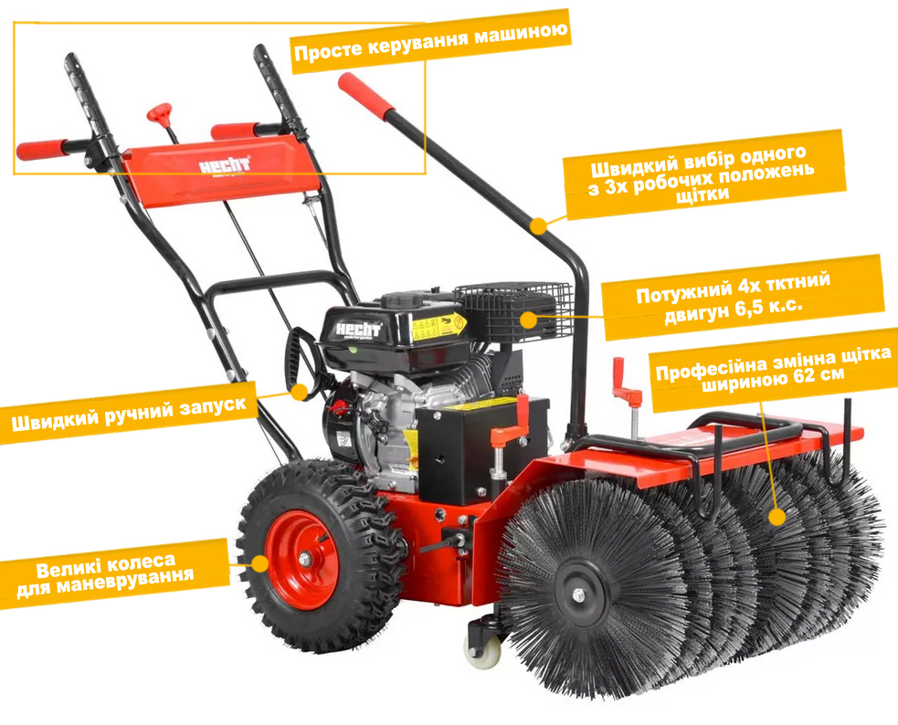 - варто зауважити, що ви можете доповнити цю машину коробом для збирання сміття, відвальним щитом та снігоприбиральною фрезою. З великою потужністю та колесами високої прохідності прибирання двору чи доріжок стаєть дійсно легкими та приємними.Отже, п ідмітальні машини з брендом Hecht® дають вам задоволення протягом усього року. ЩІтки є змінними та можуть бути придбаними в нашому сервісному центрі.
