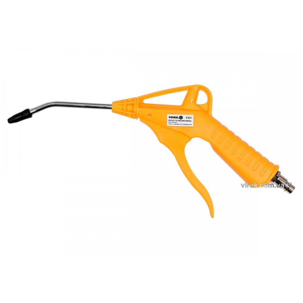 Пістолет VOREL 81631 з подовжувачем для продування стиснутим повітрям. Ідеально підходить для видалення бруду та пилу з машин, пристроїв та двигунів, а також для використання в домашній майстерні та гаражі.