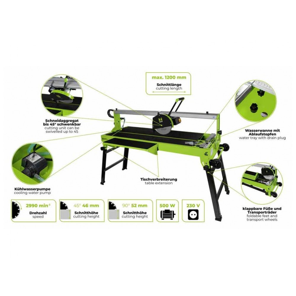Швидкість обертання круга 2990 об/хв забезпечує якісне і чисте різання будь-якої плитки, а діаметр круга 250 мм і стіл розміром 1250x460 мм з можливістю розширення дозволяють працювати з досить великими заготовками. Для різання невеликих заготовок є обмежувач з вимірювальною шкалою. Знімні ніжки дають можливість зручно транспортувати обладнання з об’єкта на об’єкт і швидко його монтувати. Верстат може встановлюватися на ніжках або на рамі. В інтернет-магазині KMA.UA ви можете купити плиткоріз Zipper ZI-FS250-1200 з гарантією 12 місяців і доставкою по Україні.
