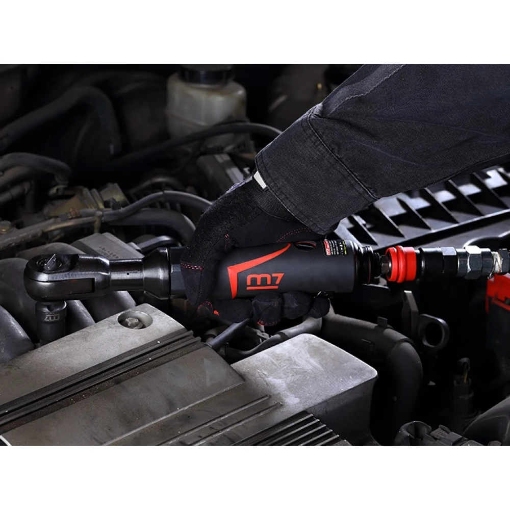 Mighty SevenNE-483- пневматична трещітка для роботи з торцевими головками з посадковим квадратом 1/2". Максимальне робоче зусилля затяжки становить 135 Нм. Корпус повністю виготовлено з легкого металевого сплаву. Трьохкомпонентний планетарний механізм відрізняється збільшеною міцністю і стабільністю. Швидкість закручування регулюється силою натискання на курок.