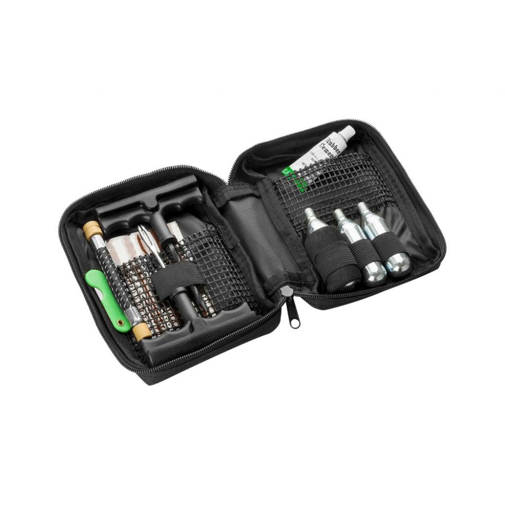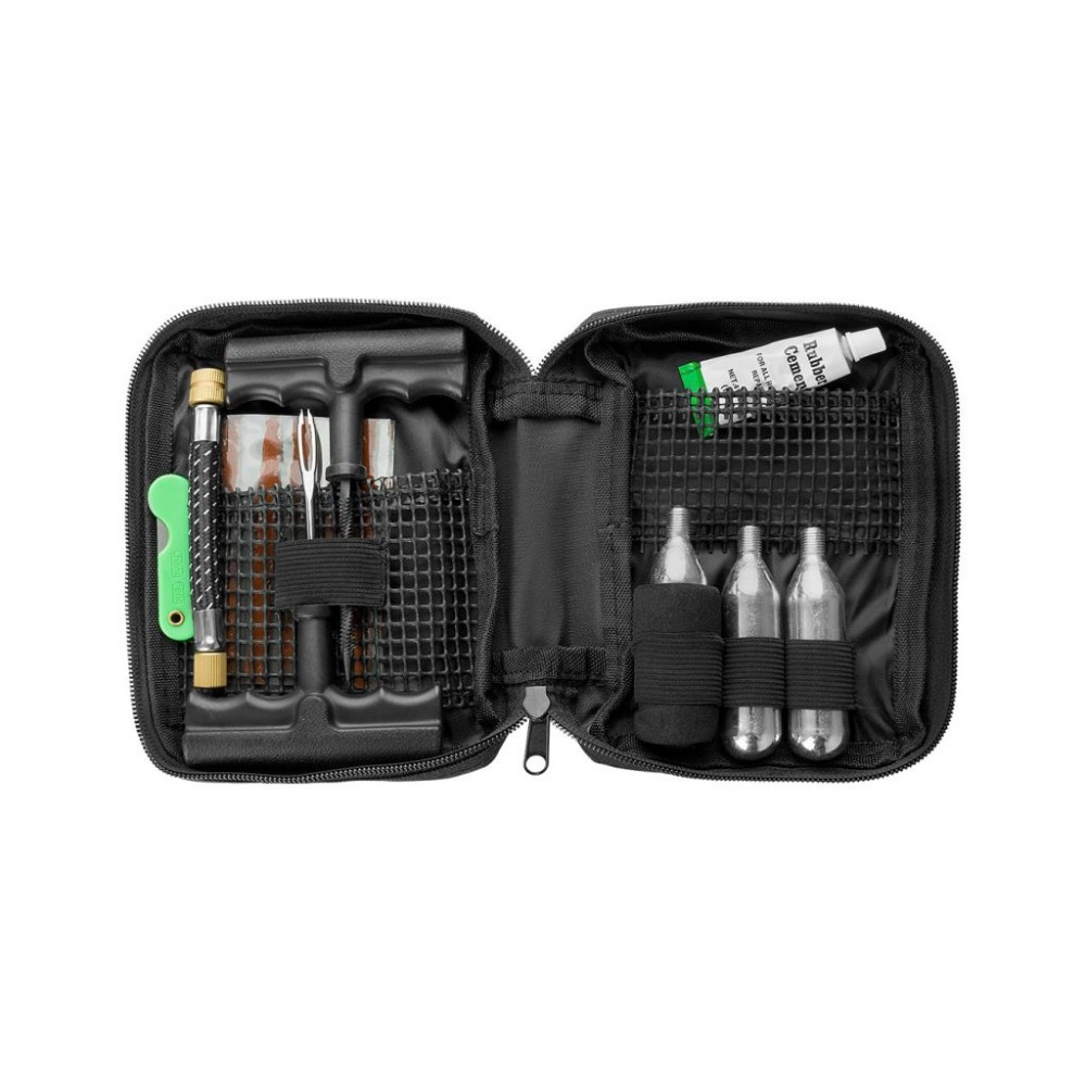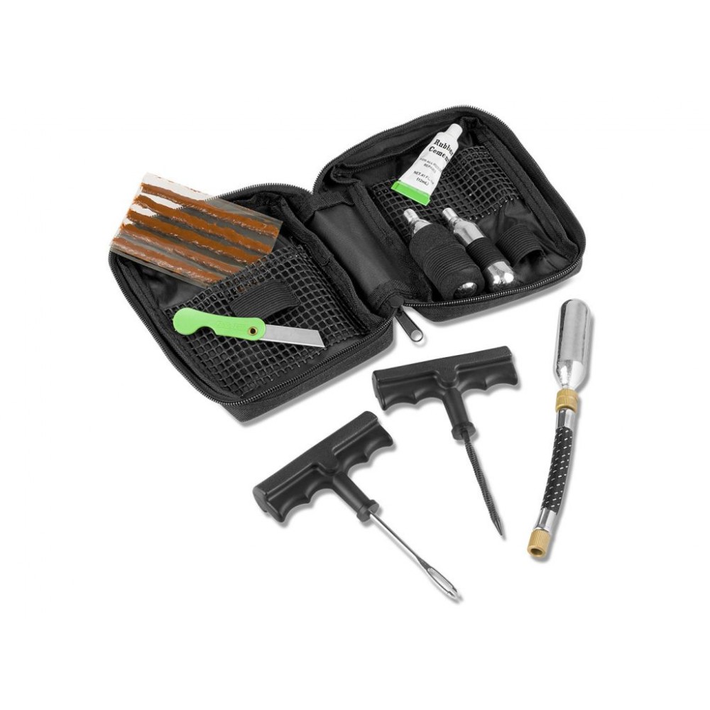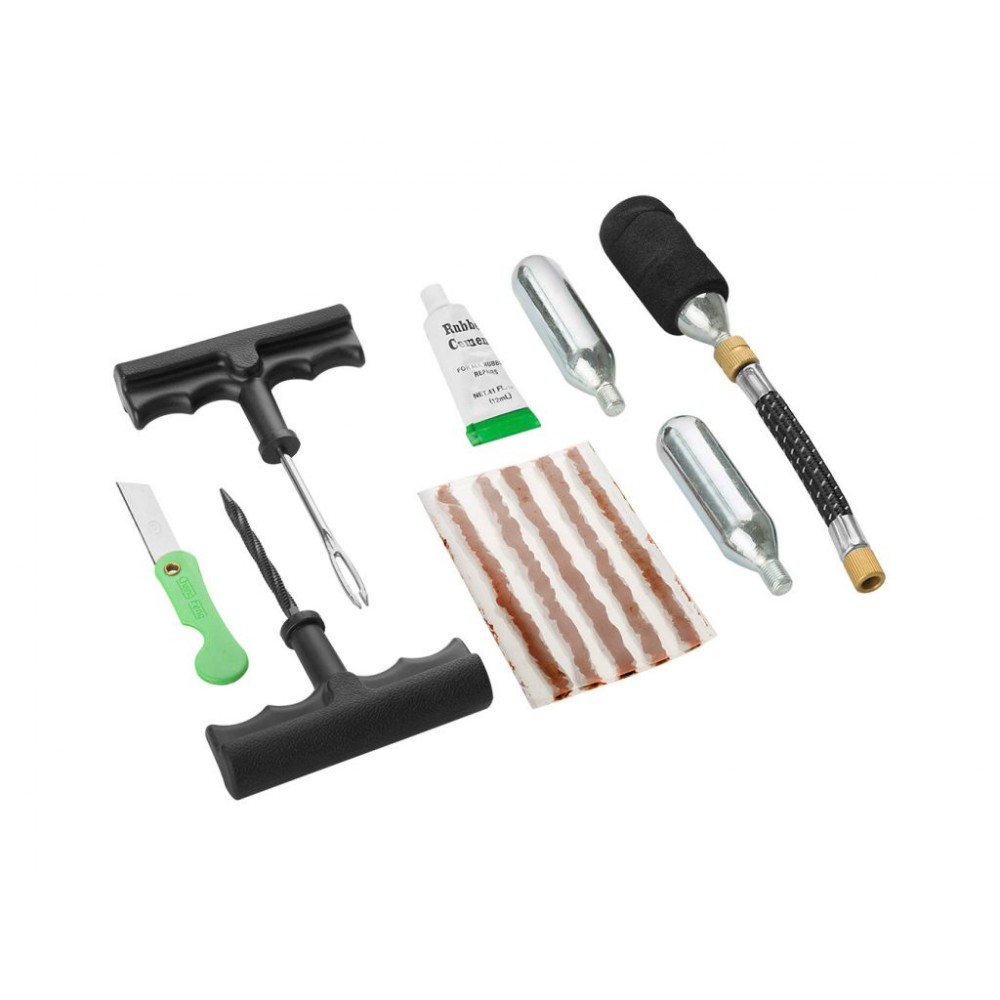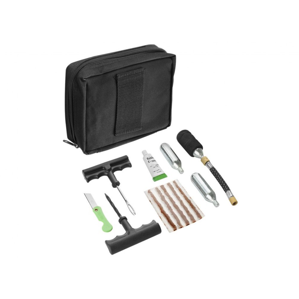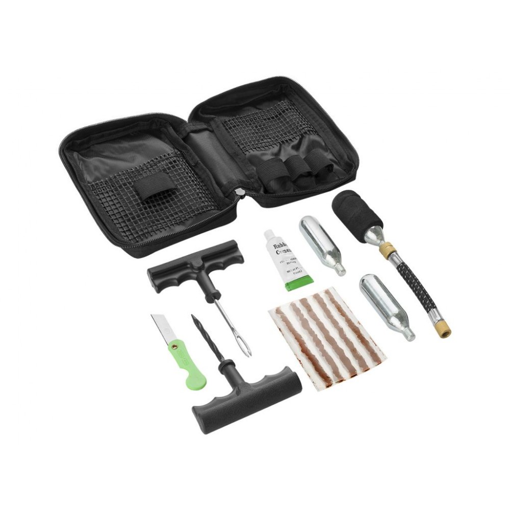Портативний комплект для ремонту шин з CO2 REDATS підходить для ремонту безкамерних шин легкових автомобілів, мотоциклів, скутерів та велосипедів. Містить усе необхідне для швидкого та ефективного ремонту невеликих пошкоджень (13 одиниць), компактно скомпоноване у зручному кейсі. В наборі ви знайдете набір латок, спіральне шило, голку, різак, клей, а також набір балончиків з CO2 та шланг-перехідник.