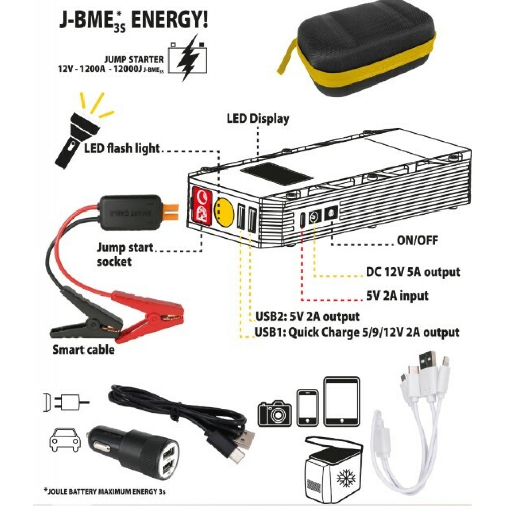 - Пуско-зарядний пристрій; - кабель; - крокодили; - адаптер для автомобільного прикурювача; - тканинний чохол; - інструкція з експлуатації; - гарантійний талон