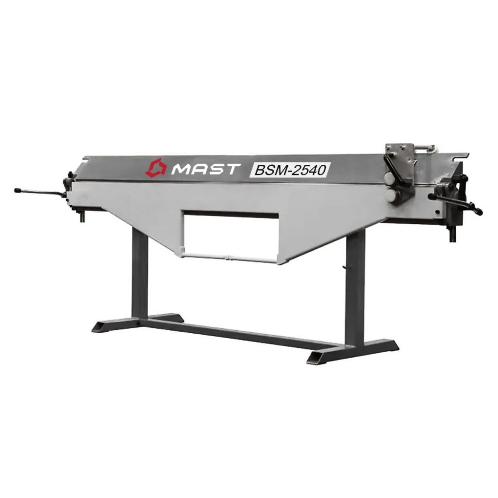 Ручний листозгинальний верстат з ріжучим ножем MAST BSM-2540 - це інструмент з ручним керуванням який має жорстку зварену конструкцію. Також присутні ексцентриковий механізм і напрямляючий вертикальний вузол переміщення притискної балки, суцільний сталевий куточок з гострою геометріює для отримання на заготовках малий R при згинанні, згинальна балка має вузол налаштування прямолінійності. Верстат ідеально підходить для роботи з чорною та оцинкованою сталлю. Верстат MAST BSM-2540 є універсальним для роботи з відливами, відкосами, додатковими елементами покрівлі, в тому числі і для роботи з великогабаритними виробами - такими як квадратна вентиляція (загальні габаритні розміри верхньої притискної балки становлять 170х170 мм). Можливість згинання від 0° до 135° – за один згин, згинання до 180° – з дотисканням у притискній балці.