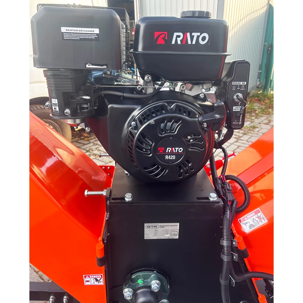 GTM P4206 - промисловий подрібнювач гілок, призначений для дроблення свіжих і сухих гілок, рейок та інших дерев'яних відходів. Ріжуча система являє собою диск діаметром 350 мм з 2 ножами з корозійностійкої сталі А8 і приводиться в рух бензиновим двигуном Rato R420 на 15 к.с. Завдяки високій потужності максимальний робочий діаметр гілок досягає 150 мм.