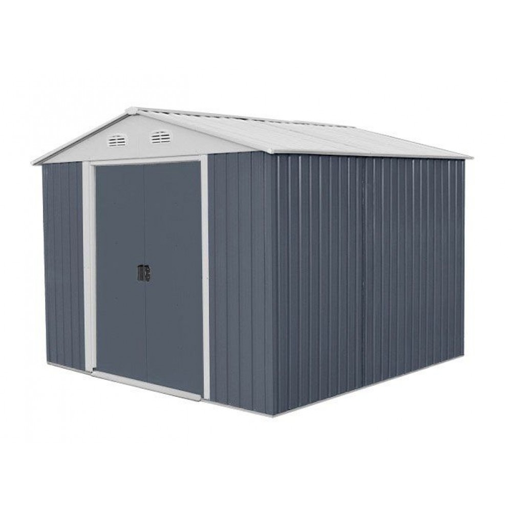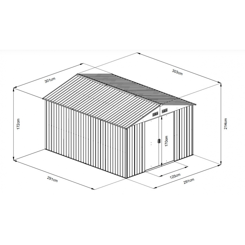 HECHT 10x10 PLUS - сучасний садовий будиночок з міцного металу, ідеальний для зберігання інвентарю та садового інструменту. Великі розсувні двері, вентиляція та міцна конструкція роблять його надійним та зручним. Можливість зберігати багато речей завдяки великим розмірам (303 x 301 x 214 см). Надійність і стійкість завдяки металевій конструкції товщиною 0,6 мм та покриттю товщиною 0,3 мм. Сучасний дизайн додає шарму вашому саду.